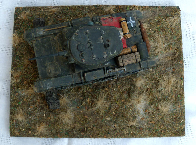 Если это диорама, то композиция неудачна. Танк смещен от центра в угол и образуется ничем не занятое пустое место. Из-за этого пропадает весь смысл, если он конечно был. Если это подставка под танк, то она слишком большая, и совершенно не гармонирует и не акцентирует внимание на танке. Танк просто теряется на такой подставке.