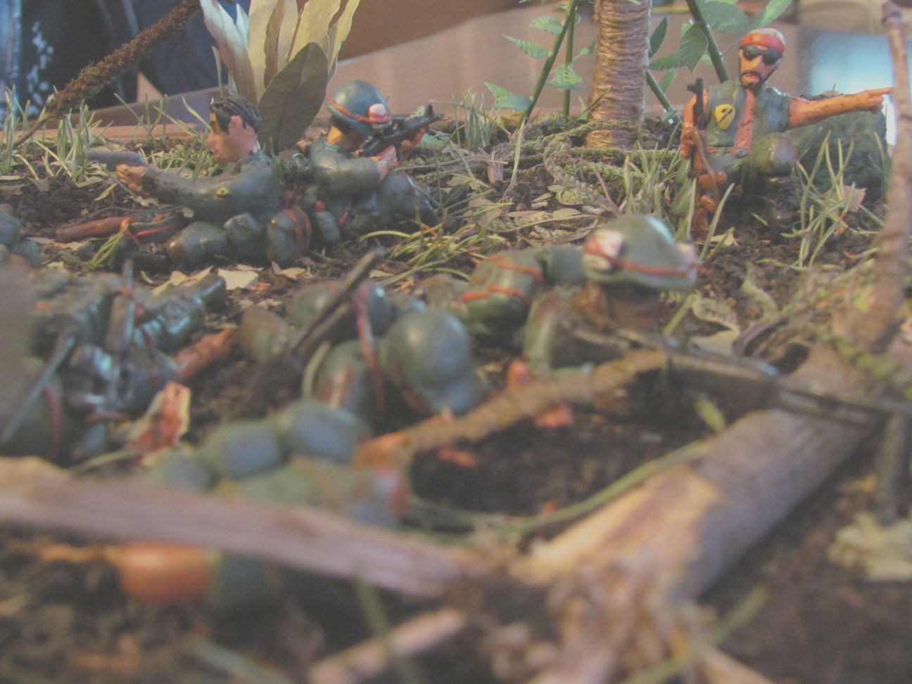 Лепил просто из обычного детского пластилина. Основание сделано из пластинок ДСП, засыпал чёрным чаем, лаврушкой, сухой листвой, немного мха. Пальмы из мешочных ниток. На создание диорамы толкнул фильм " Мы были солдатами"Сюжет: Дождь, грязь, назойливые насекомые, усталость, дырявые сапоги. Идёт взвод "Американских мальчиков" и штатов Техас, Канзас, курят,смеются разговаривают. И тут выстрел... Билли упал замертво, и сразу автоматные очереди со всех сторон, крики Вьетнамцев, взрывы, обстрел такой, что невозможно поднять голову. Все разом упали в грязь, казнив при этом своё оружие. Командир понимает, что взводу приходит конец, взвод окружён. При детальном рассмотре диорамы, становится ясно, что действительно, приблизительно через 5 минут, не останется никого...