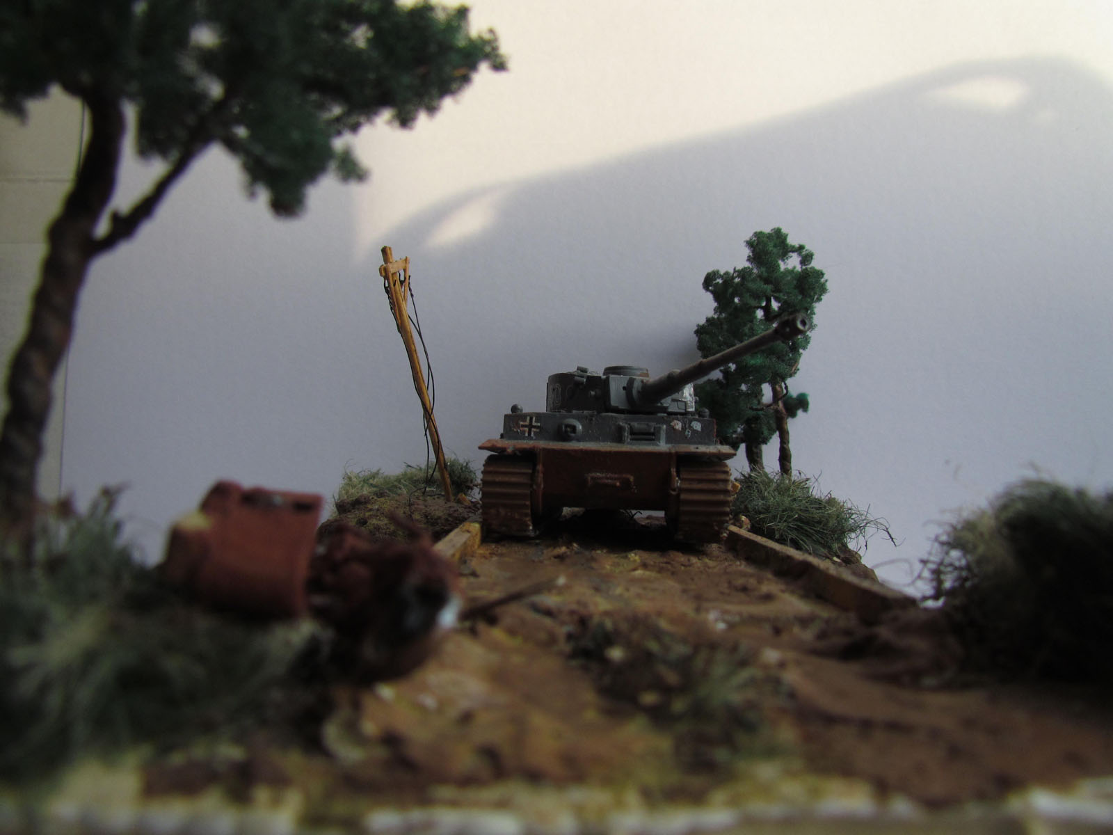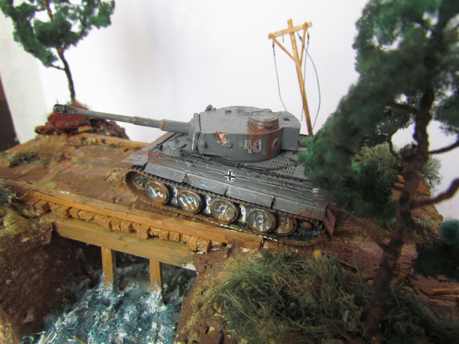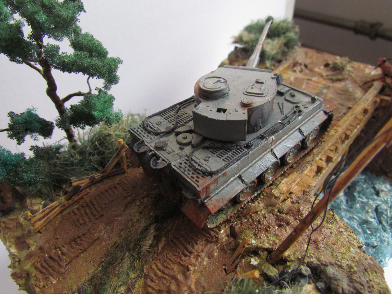 "Тигр" фирмы "Моделист". Окрашивал краской "Супер" от "Звезды". Основа лист фанеры (берега-пенопнаст), покрытие Сухой ровнитель для стен(спасибо ремонту=D)+песок. Мост из резаных и двух целых "штапиков". Много раз переделывал воду , но вроде что-то вышло=).деревья делал из прволки и молотой губки. Трава из сан.тех. льна. Мотоцикл из проволки, эпоксилина, коляска из бумаги, колеса из стопорных шайб)).Сначала хотел мотоцикл пустить перед танком, но не хватило навыка сделать водителя (да еще в таком меленьком масштабе), не проподать же добру - состарил, сломал и внес в диораму)) Это моя первая работа- все замечания и советы приветствуются))) Надеюсь улучшить качество в следуюших работах. Спасибо.