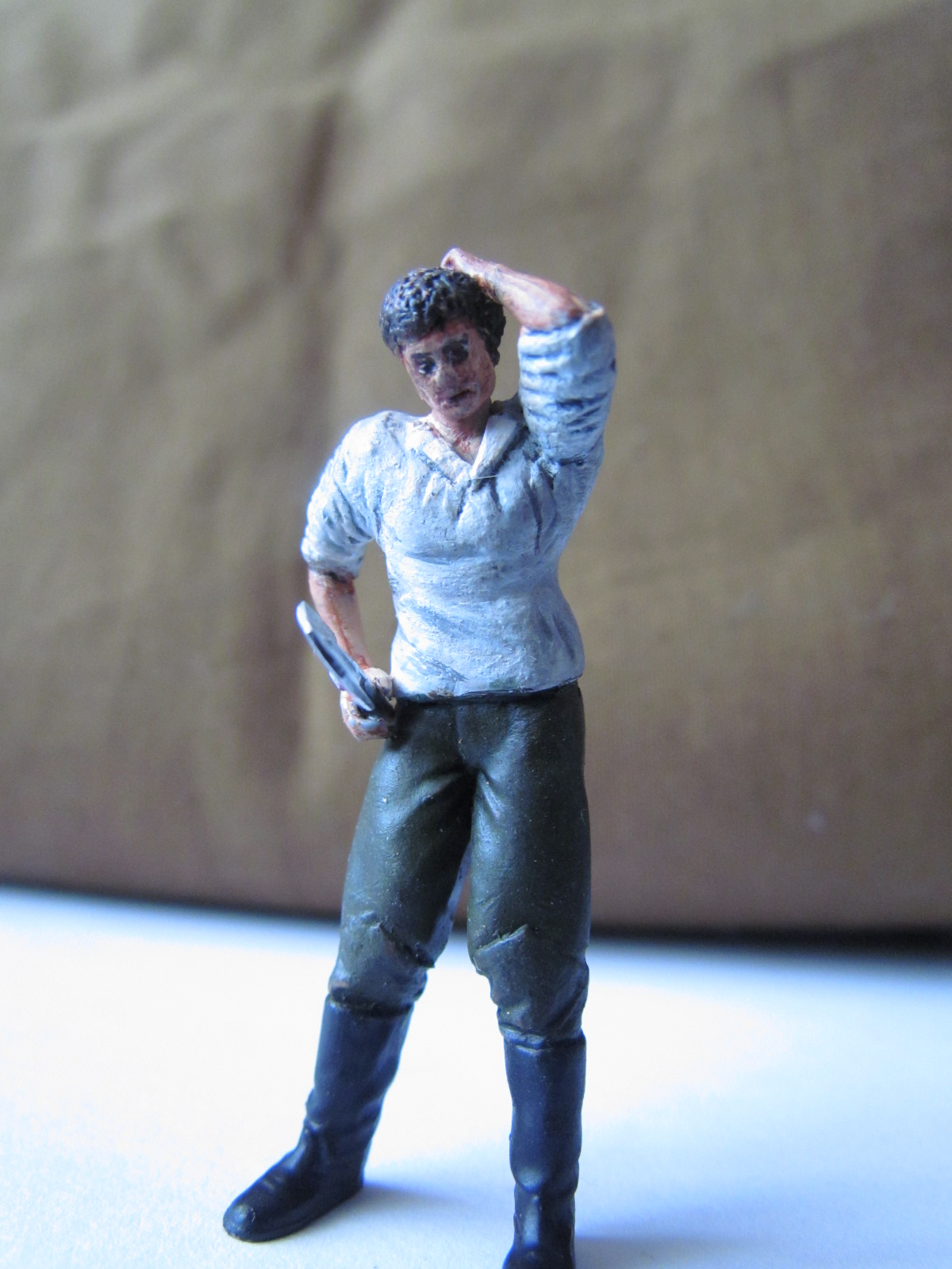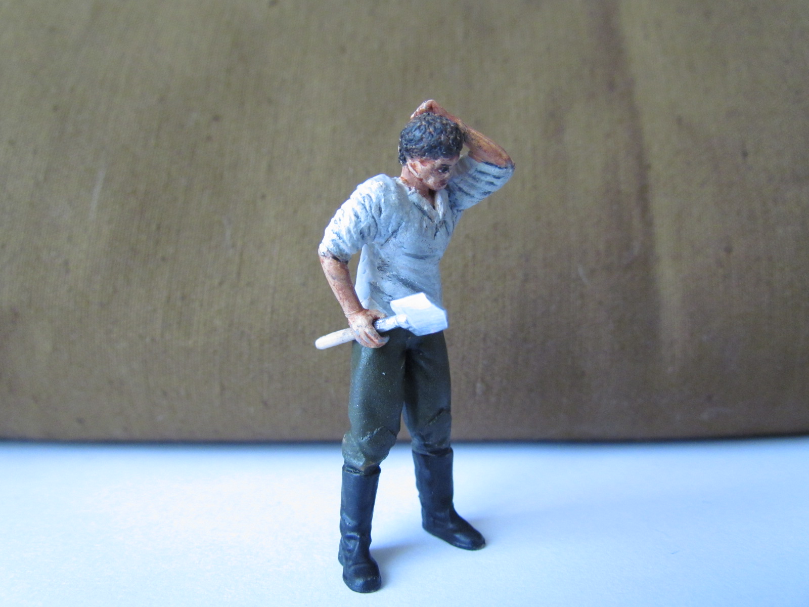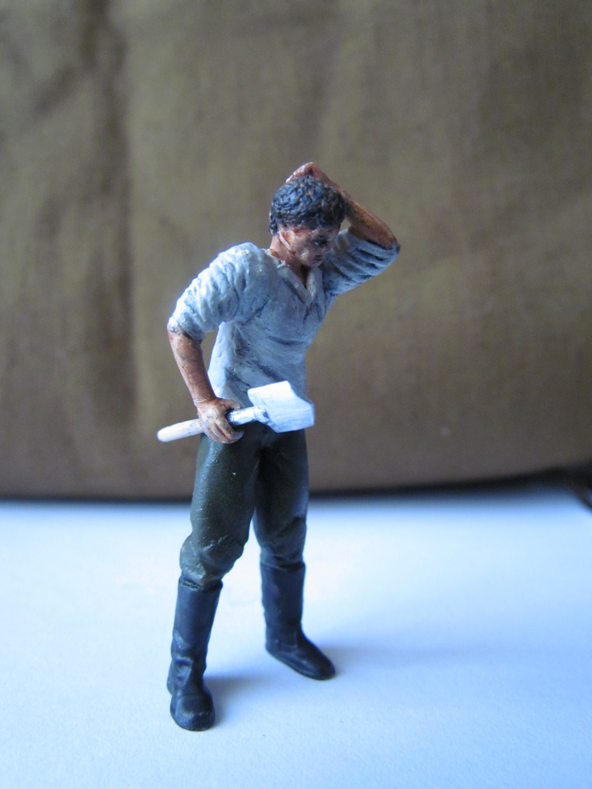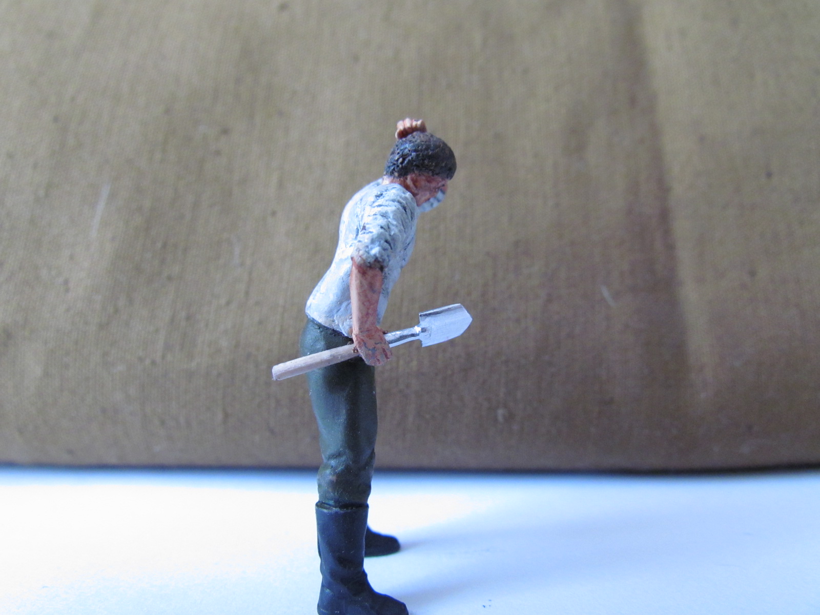 Тело, голова и правая рука самодельные из пластики, рукава рубахи и волосы -двухкомпонентка. И уделю внимание лопатке, выточена из аллюминия( специально еще не красил в 4БО) ручка из зубочистки. Красил акрилом, но еще нужно штаны довести до ума и колени замарать. Первая полноценная фигурка. Жду советов и критики!