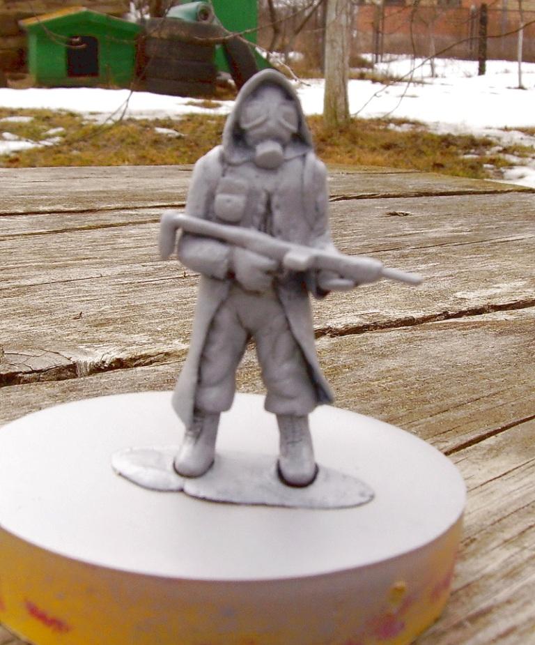 После того, как я поиграл в игру метро 2033, мне захотелось сделать фигурку по этой игре. Так как под рукой не было термопластики, то я начал делать фигурку из эпоксилина. Эпоксилин, впрочем, лучше термопластики по прочности. По крайней мере, я лепил все остальные работы из детской термопластики, поэтому фигурка из эпоксилина получилась тверже и крепче. Фигурка каркасная. Сделана полностью из эпоксилина. Оружие рюкзак тоже пришлось лепить из эпоксилина. Работа не покрашена. Эта тема, что-то вроде скульптуры.То есть фигурка сделана, но не покрашена. Подставка уже сделана, но фигурка не закреплина на ней.