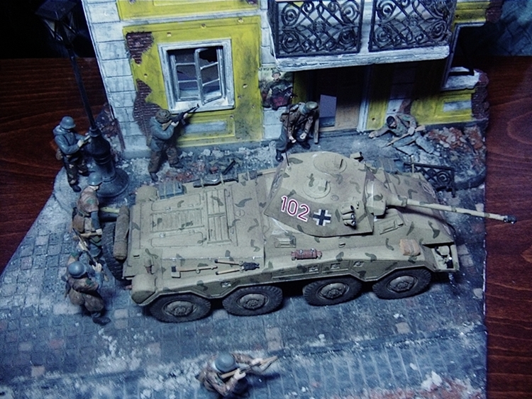 Всем привет.Представляю вам свою диорамку. БТР от Italeri фигуры от Master Box и Dragon здание от MiniArt. Покраска акрил, оснавание пенопласт пачкал пастельными мелками. За комментарии за ранее благодарен