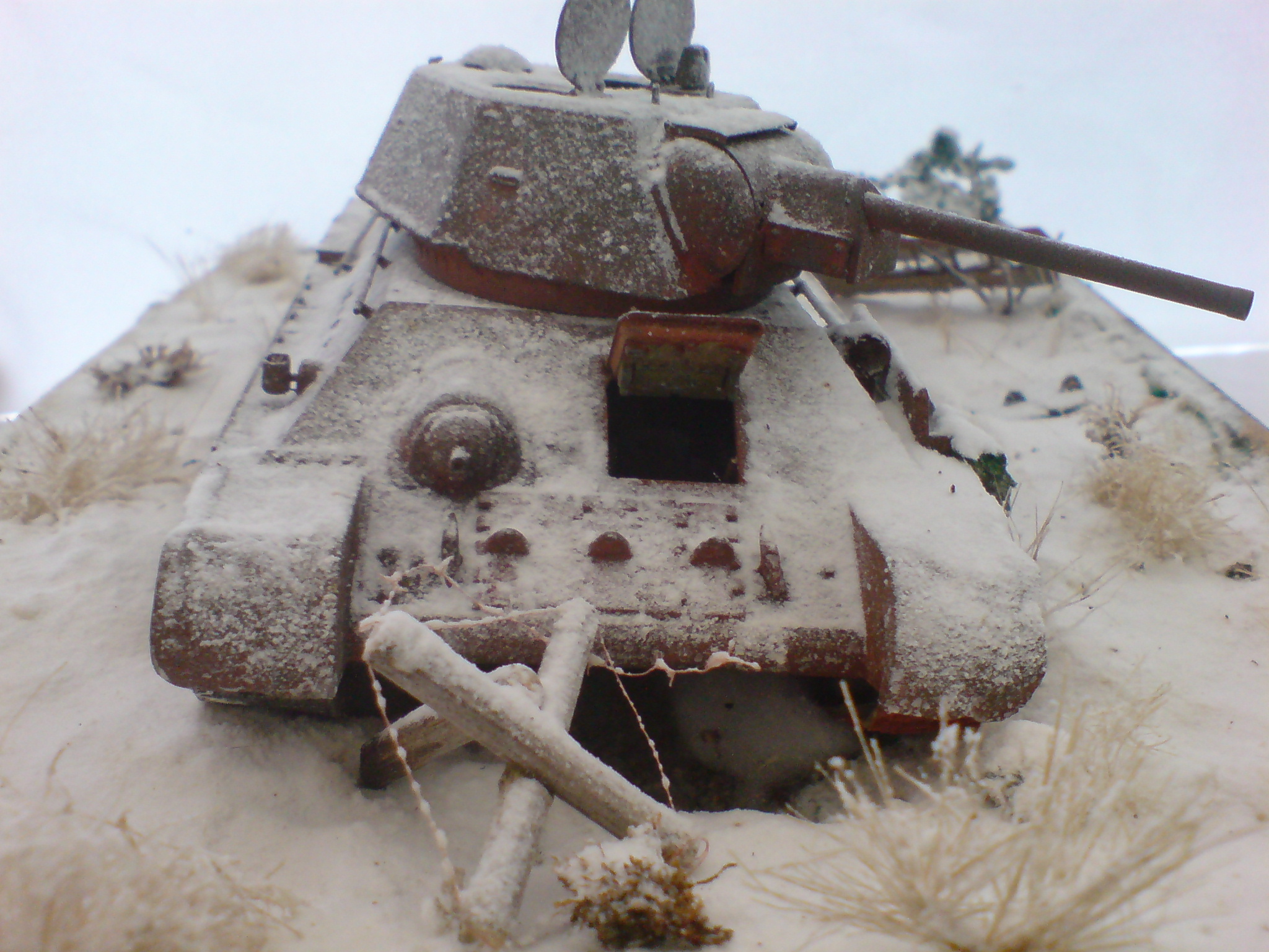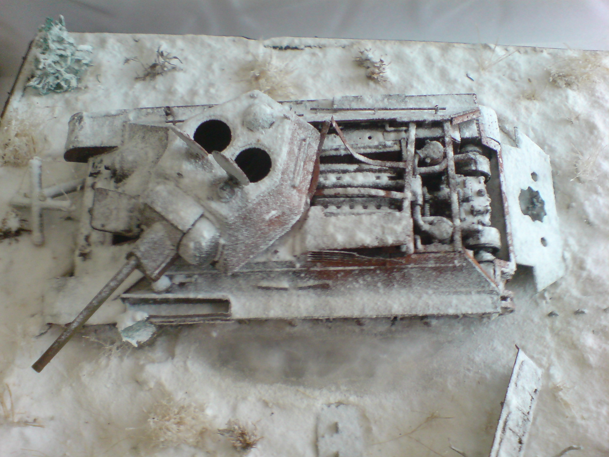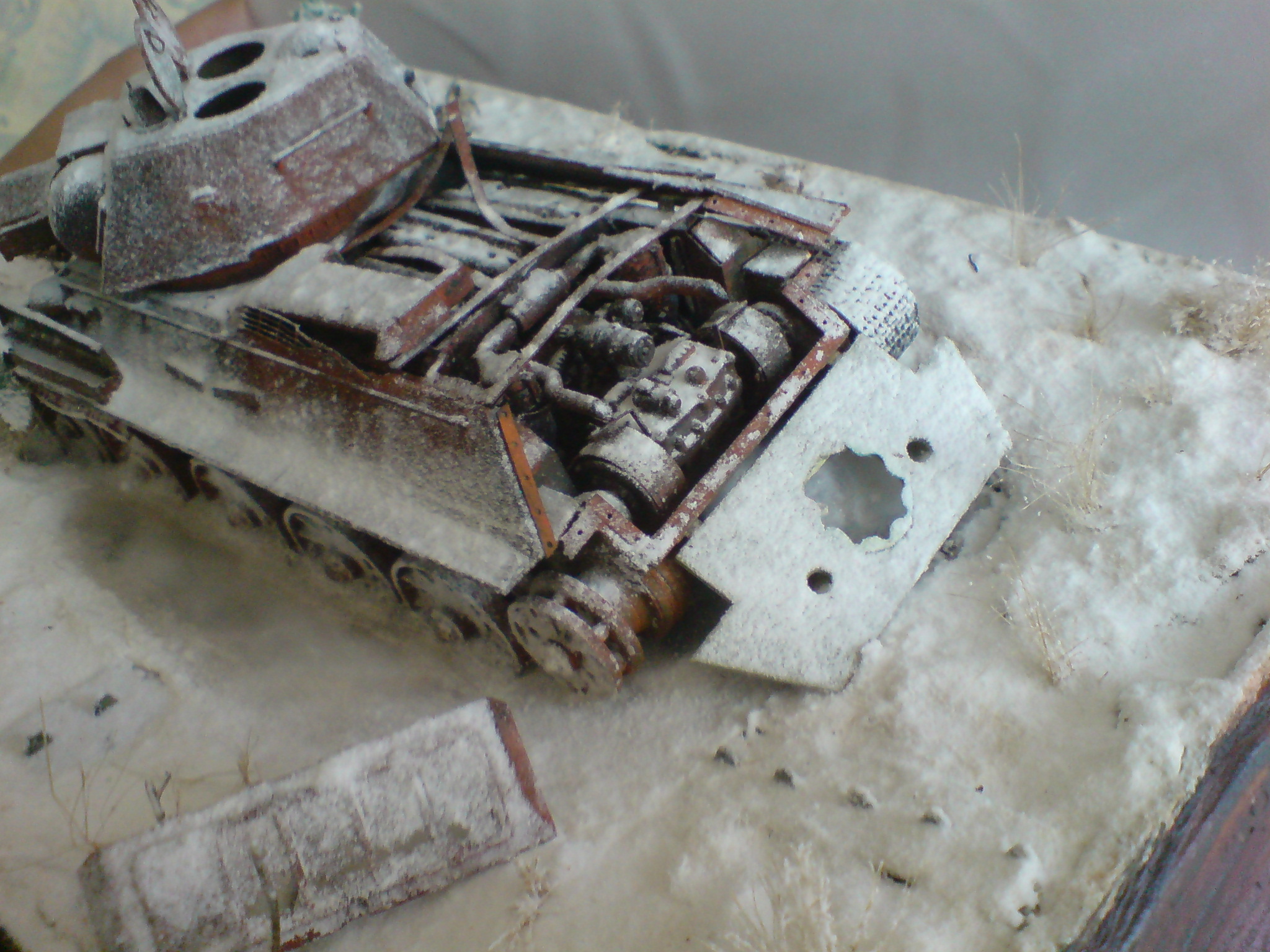 Представляю свою первую работу и хотелось бы выслушать вашу критику и советы.Собирал модели давно просто собирал как говорится из коробки,без доработак и покраски,но вот решил попробовать себя в доработке и покраске.Нашел в старом хламе Т-34-76 фирмы звезда и на ней решил попробовать изобразить подбитый и давно брошенный танк.Интерьер моторного отсека использовал фирмы Миг,точенный ствол не помню какой фирмы(заказал в интернете)краски тамиевский акрил,пигменты Мига.Основание пенопласт,снег сода с пва,высохшая трава сантех лен,ящик зип вырезан из пивной банки,замерзшая лужа в которой стоит танк вырезана из пластиковой бутылки.Жду ваших советов и критику.С Ув.Александр