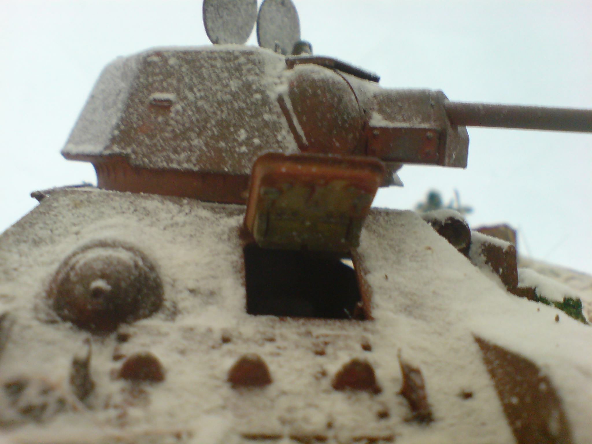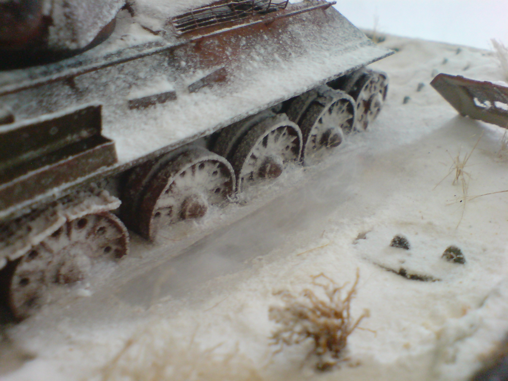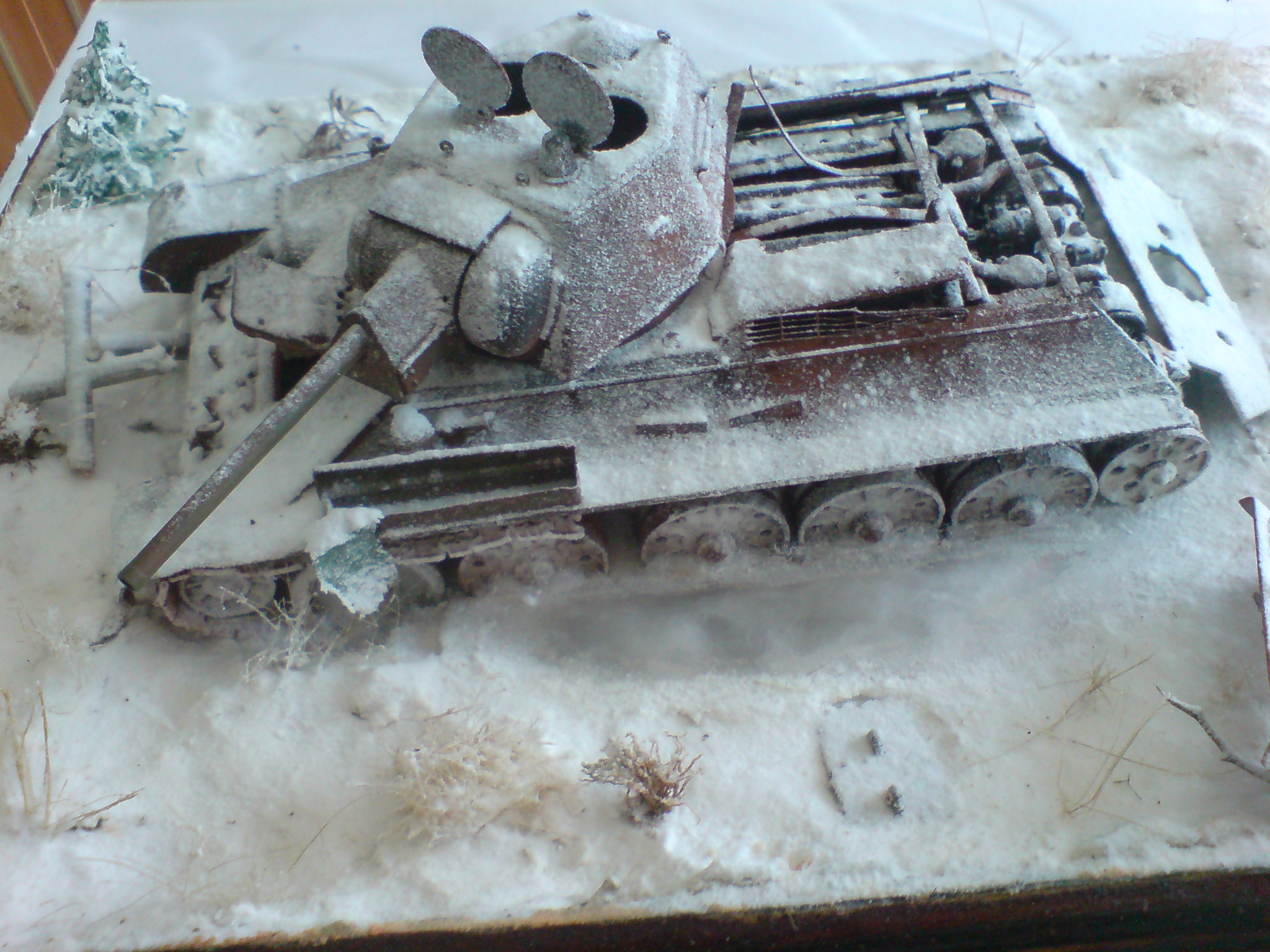 Представляю свою первую работу и хотелось бы выслушать вашу критику и советы.Собирал модели давно просто собирал как говорится из коробки,без доработак и покраски,но вот решил попробовать себя в доработке и покраске.Нашел в старом хламе Т-34-76 фирмы звезда и на ней решил попробовать изобразить подбитый и давно брошенный танк.Интерьер моторного отсека использовал фирмы Миг,точенный ствол не помню какой фирмы(заказал в интернете)краски тамиевский акрил,пигменты Мига.Основание пенопласт,снег сода с пва,высохшая трава сантех лен,ящик зип вырезан из пивной банки,замерзшая лужа в которой стоит танк вырезана из пластиковой бутылки.Жду ваших советов и критику.С Ув.Александр