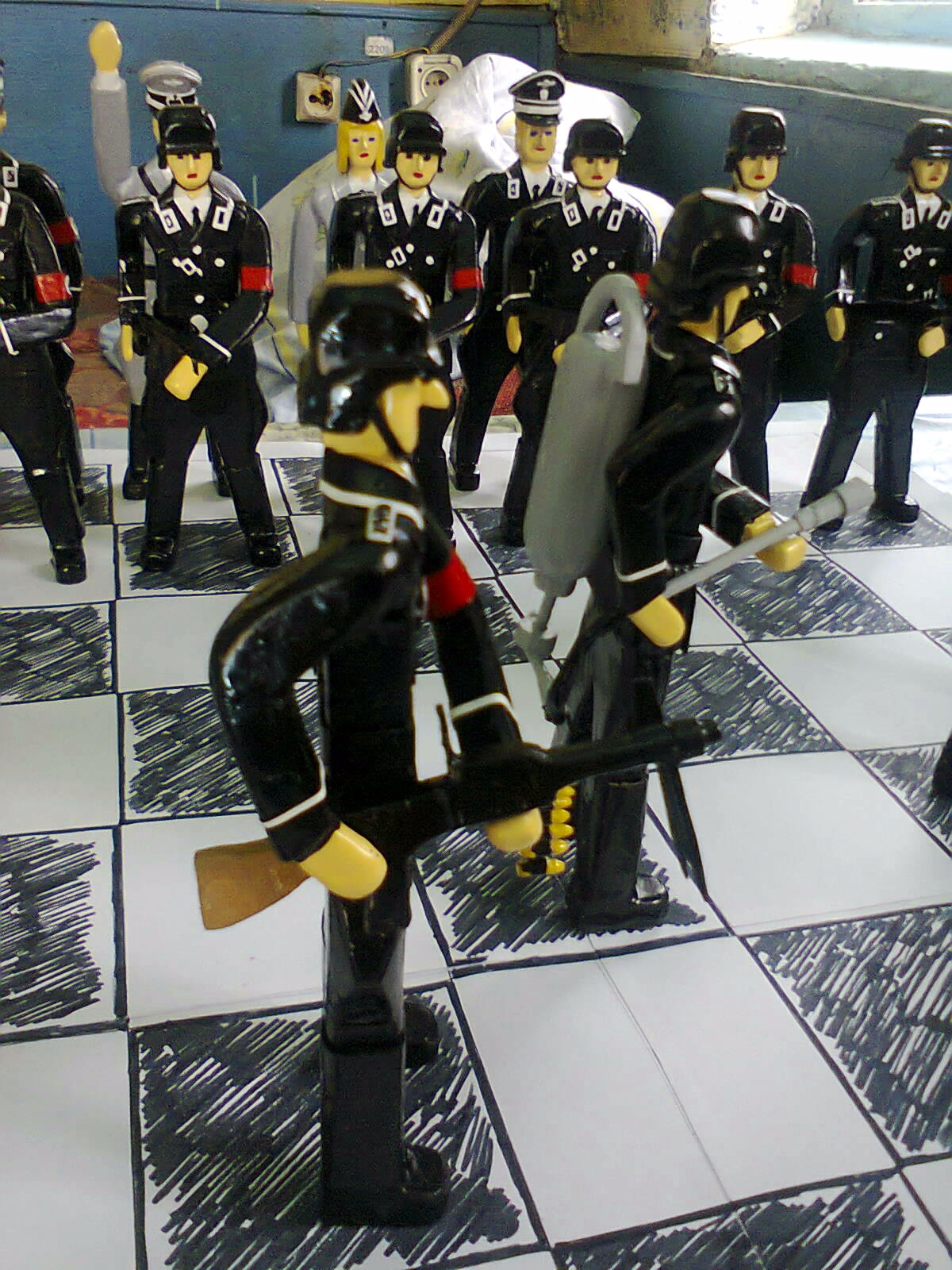 Решил попробовать сделать немного более осовремённый комплект шахмат. В качестве противоборствующих сторон выбрал войска СС Германии и советские войска.Пока сделал только одну "армию". Работа длилась 58 дней. Вместо короля - естественно Гитлер. Ферзь (она же королева) естественно женщина (фюрерина из вспомогательных частей СС).Слоны - офицеры. Вместо ладьи - решил сделать пулеметчика ( тяжелая все таки фигура) Вместо коня - огнеметчика (огонь везде проникнет. В дальнейшем с советской стороны будет точно так. А вместо короля я планирую сделать Сталина. А что сейчас получилось смотрите сами.