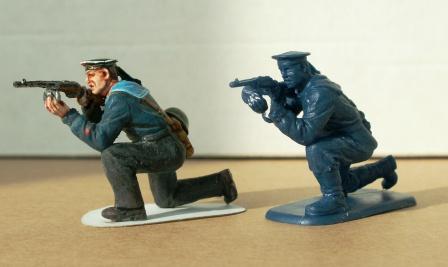 Фигурки скопировал из эпоксидки,так как с оригиналом работать трудно(полурезина,полупластик).На матросах долеплены брюки и срезаны рубахи до ремня,укорочены поля бескозырок.
