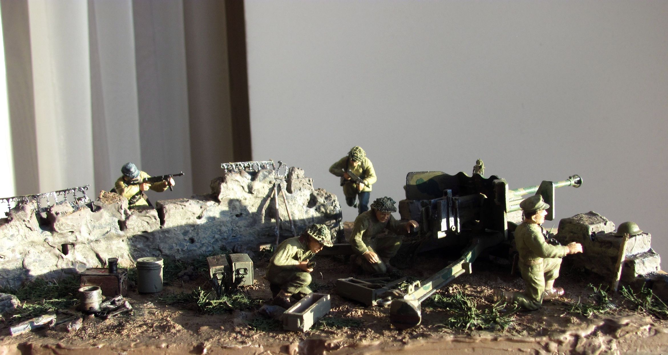 При изготовлении работ с использованием арт. установок учитывайте, что орудие у Вас установлено не на бетоне (при стрельбе на грунте остаются характерные следы от колёс и упоров). Кроме того, имеющие мозги артиллеристы никогда не оставят маск. сеть на подвижных частях, тем более одной стороной зацепившуюся за неподвижный объект (у Вас, кажется, из стены торчит арматура), это чревато неприятными последствиями.