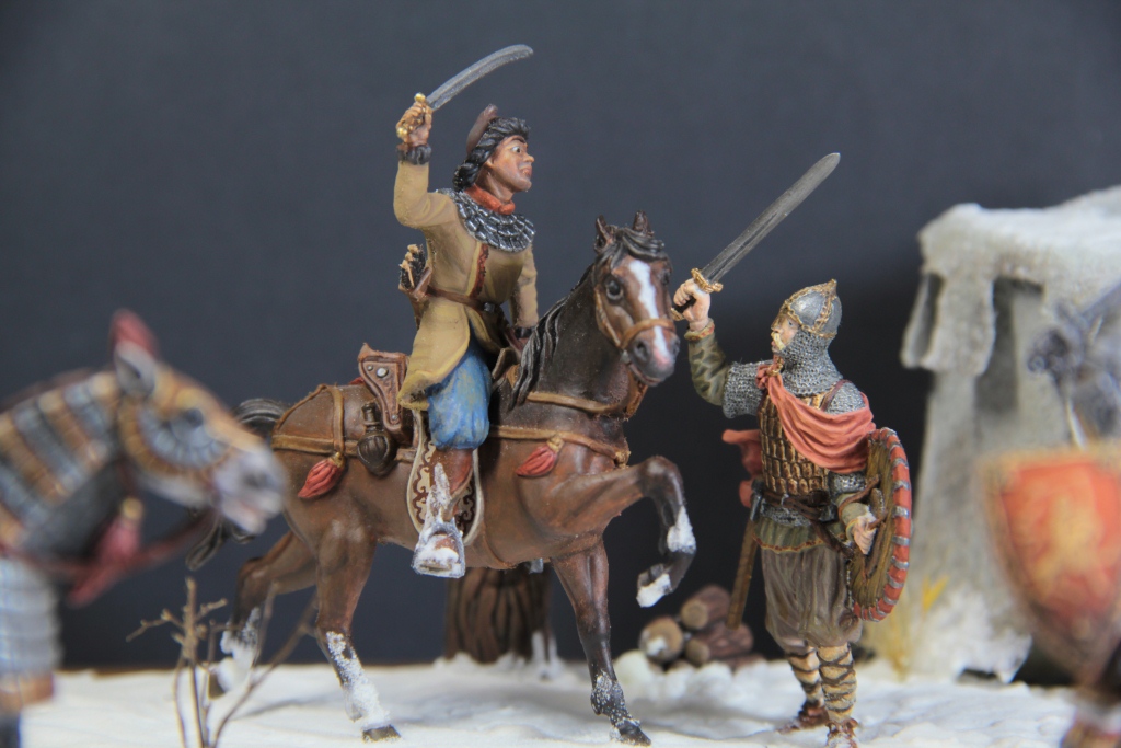 Динамики бы добавить, если это битва... А то всё выглядит как неожиданное столкновение конной группы монголов с русскими, варившими в лесу какой-то кулеш в казане. Причём, для самих монголов это столкновение было крайне неожиданным - самый последний всадник даже ещё не понял что случилось. Зато русский с красным треугольным щитом успел даже шлем с полумаской надеть! И вообще они варили кулеш в доспехах и при оружии....
