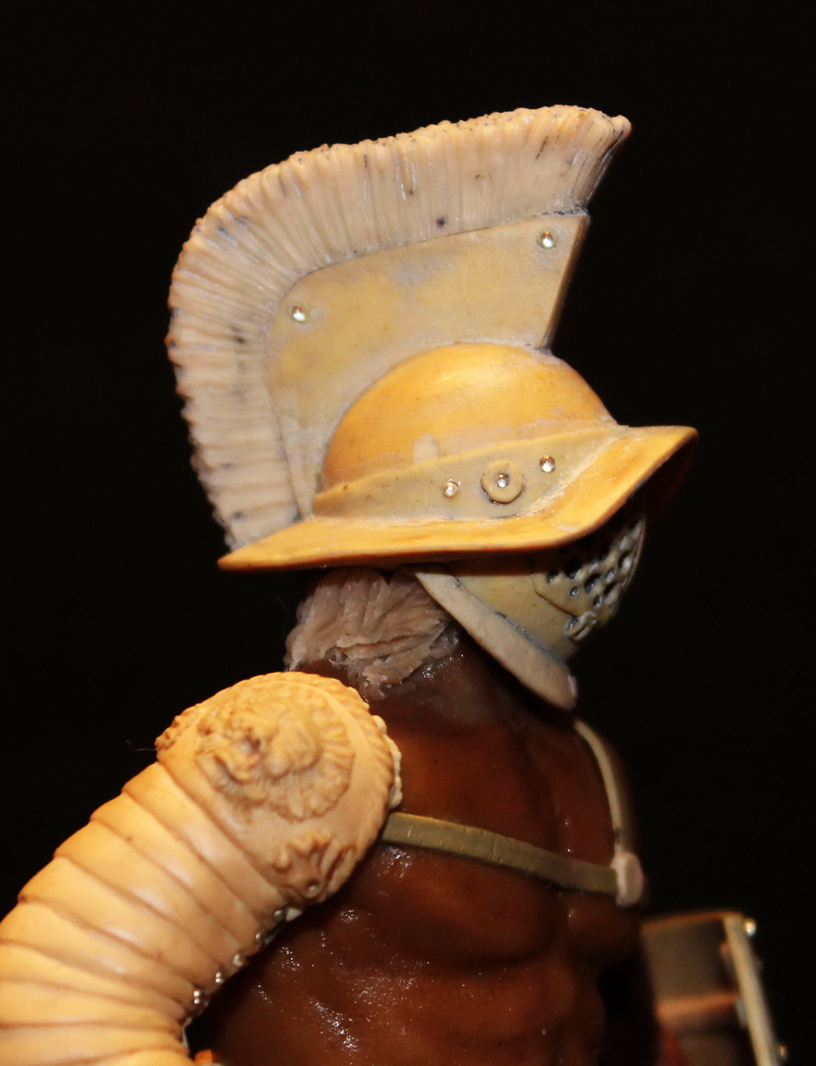 Хорош,шлем,наплечник,вообще отлично,да и сам он вполне правдиво сложен,где то читал что гладиаторов сажали на высоко калорийную диету,примерно были похожи на боксёров супер тяжей или если не добирали мыжцой то жиром закрывали,представляя собой достаточно рыхлых и массивных субъектов,делалась это якобы для того что бы растянуть бой по времени и обезопасить гладиаторов от тяжёлых ран той же жировой прослойкой.