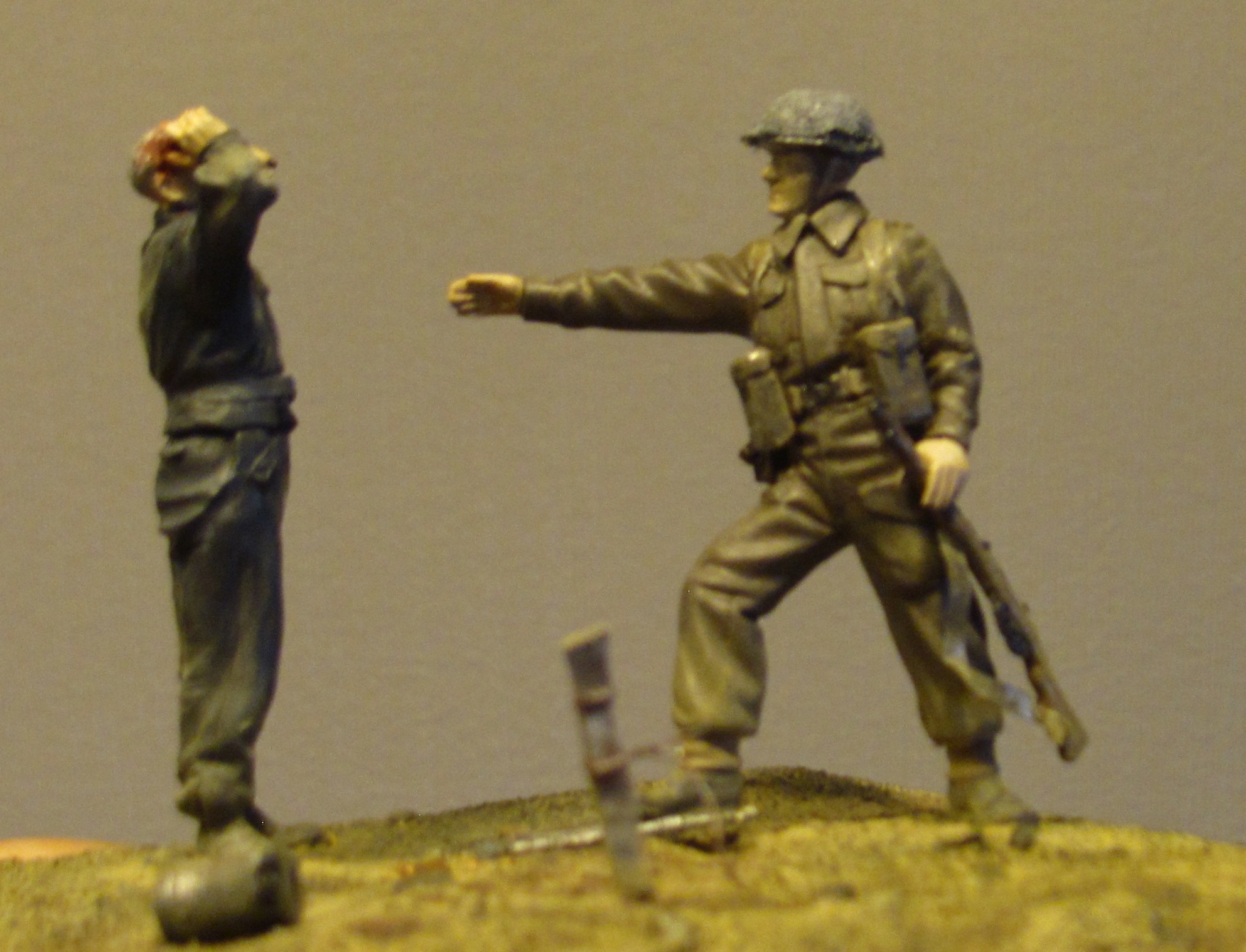 Несовсем понятно из-за разделяющего фигурки расстояния.Если бы бриту коснуться немца рукой то многое прояснится. Тогда и поза немца более понятна: он как-бы немного дёрнулся при касании - вдруг вдарят? И подставку надо ужать, а то правда много пустого места. Было бы более понятно что Томии берёт Ганса в плен.