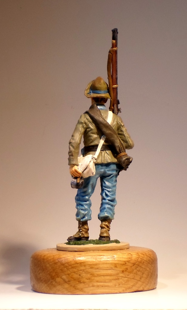 Роспись понравилась, всё красиво и аккуратно. Единственно что смущает, так это цвет мундира. Синий воротник подразумевает серый окрас . Зелёный - это уже что-то своё, принесённое из дома или где-то свистнутое, а тогда воротник должен быть одного цвета с курткой (в этом случае это не мундир получается, а куртка). Персонаж получается скорее на Западный театр войны: там и снабжение похуже было, да и штаны у парня явно из запасов северян... Так что исправить воротник, что проще, и солдат Миссисипской или Теннесийской армии во всей красе!