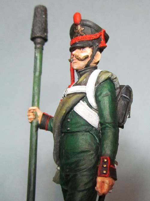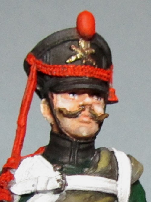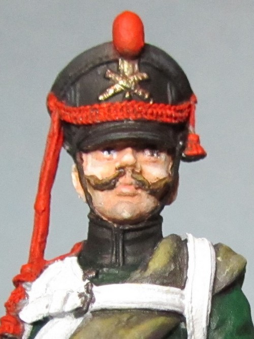 Раз выпушку н вороте исправили о ее пропускаем, но кожаная петлица на кивере должна быть черного цвета. Клапаны рукавов должны быть зелеными и выпушка вокруг них неверно показана. Ну и пуговицы на крагах надо окрасить