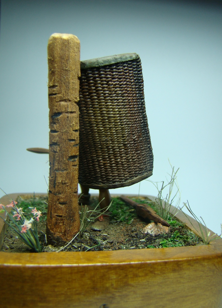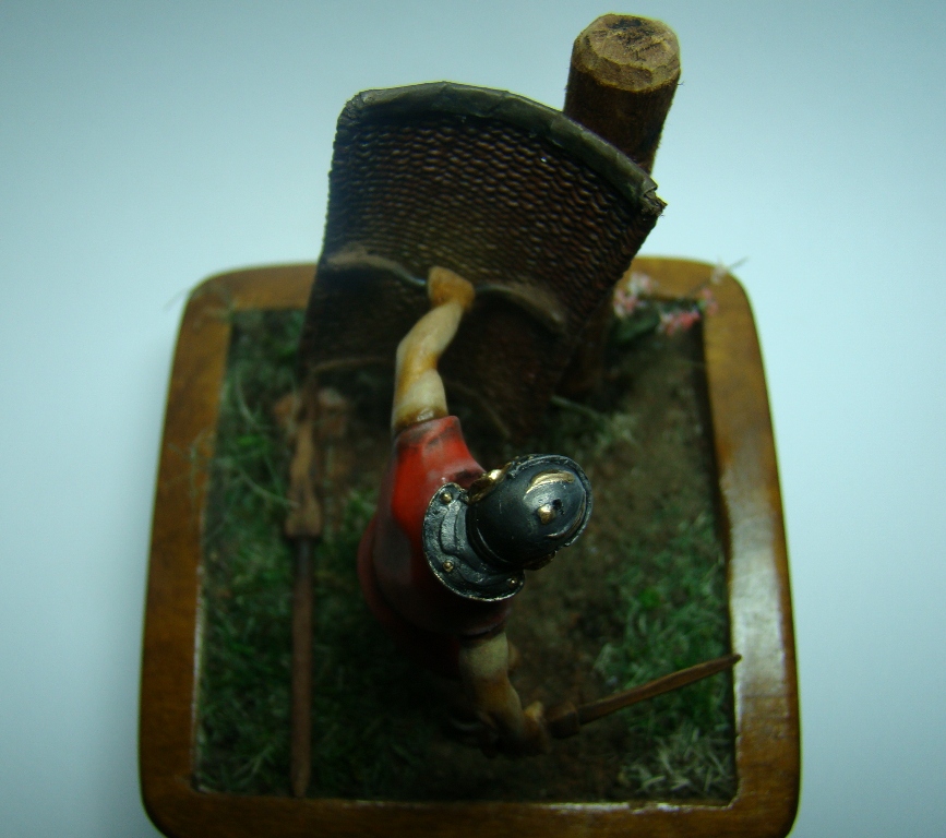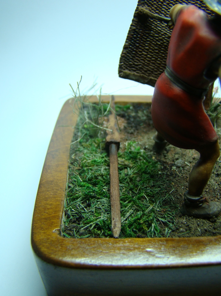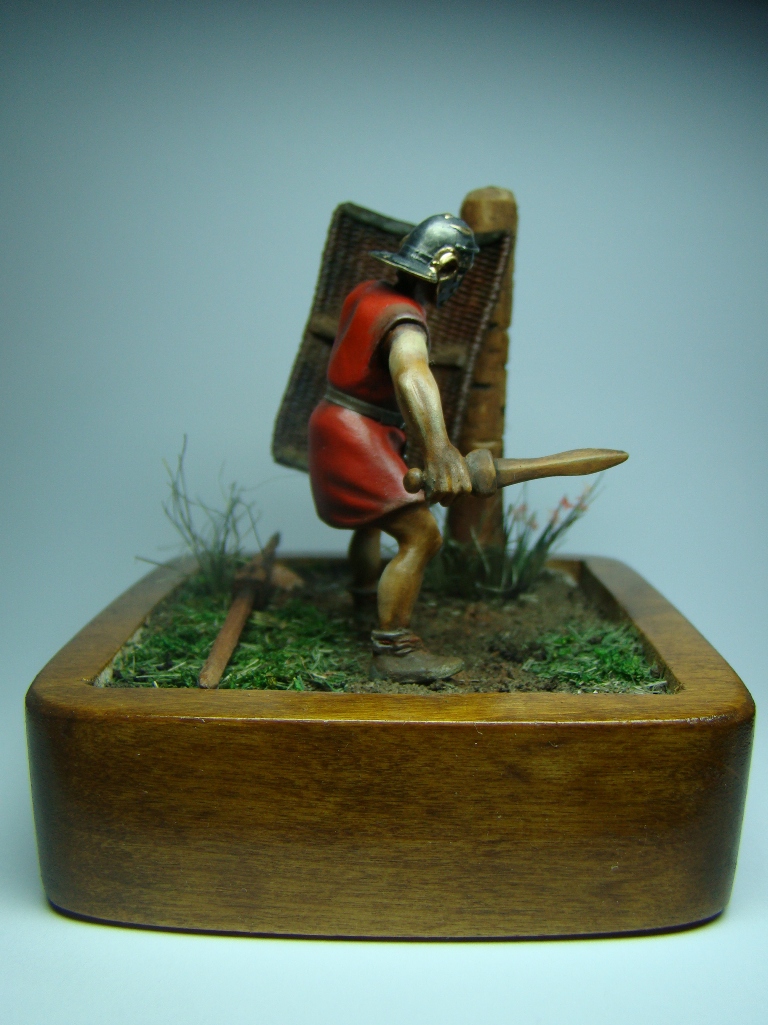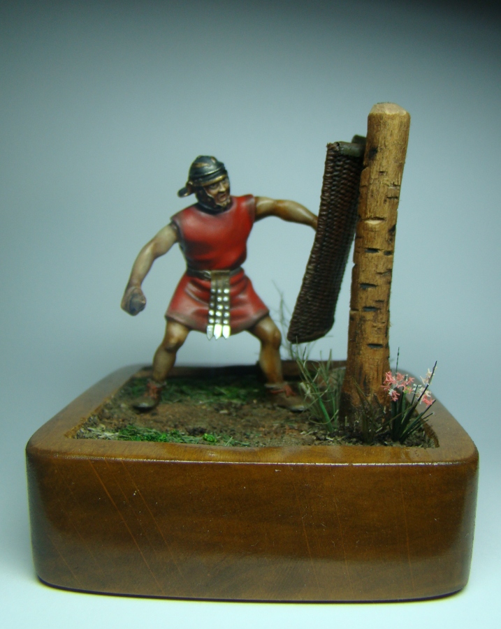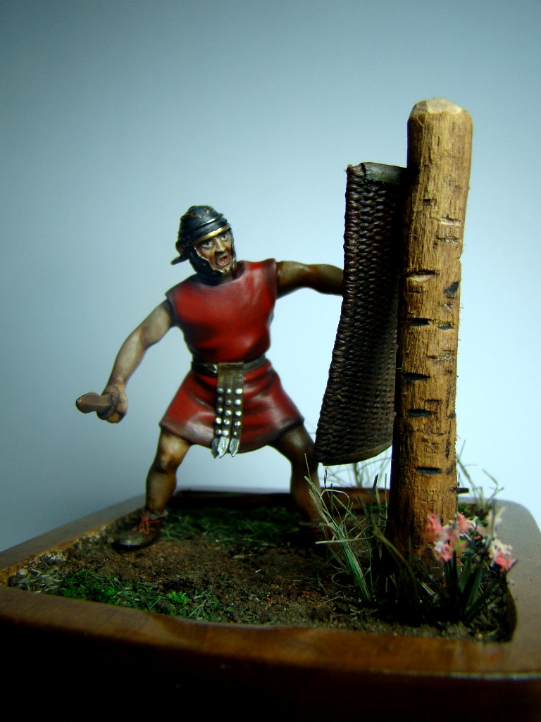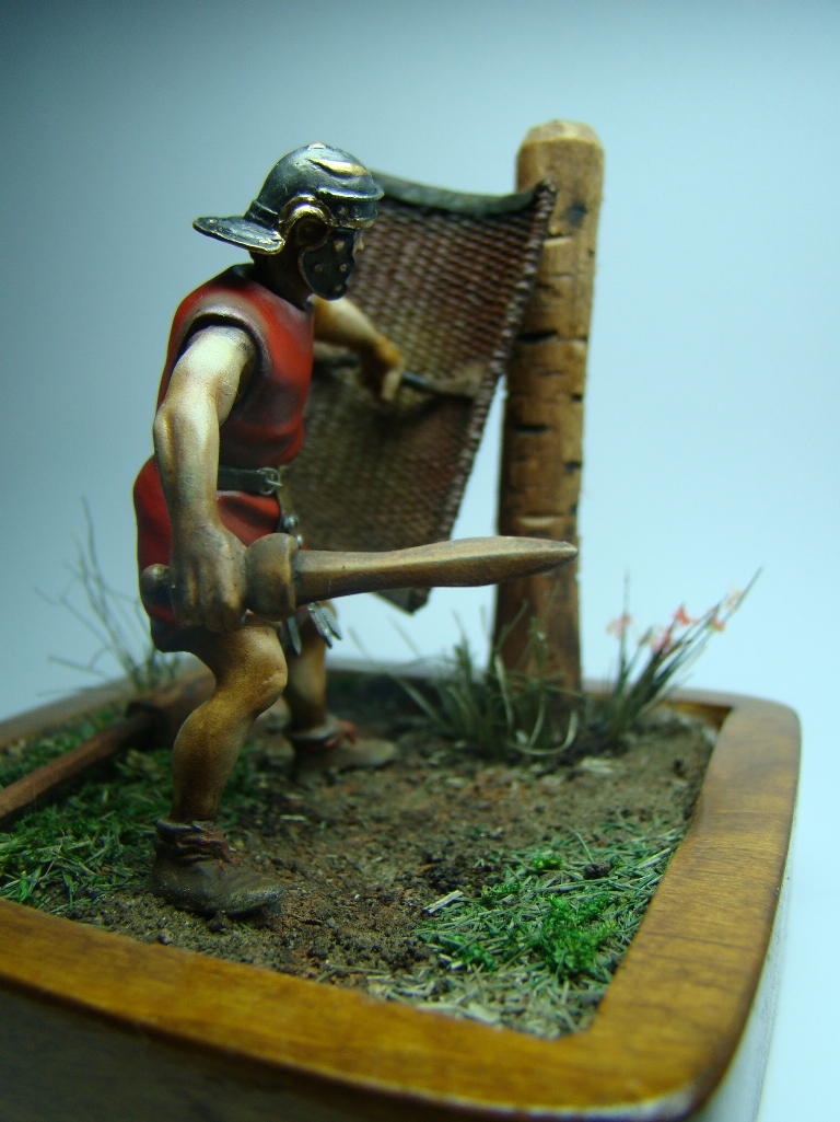 Фигурка 54мм - конверсия римского велита периода республики студии "Ермак сиб", ремень изготовлен из бумаги, учебный скутум сплетен из капроновой нитки, учебный пилум (на земле) сделан из дощечки, основание из куска ольхи, земля - обычная пересеенная-перемолотая земля, трава - мох и сизаль стриженная, столб для отработки ударов корень абрикоса. На историческую достоверность не претендую, все делалось из картинки в журнале. Роспись акрил, масло, жидкая поталь, пигменты MIG. У меня это первая виньетка (клянусь!!