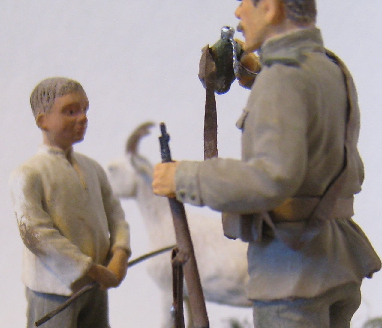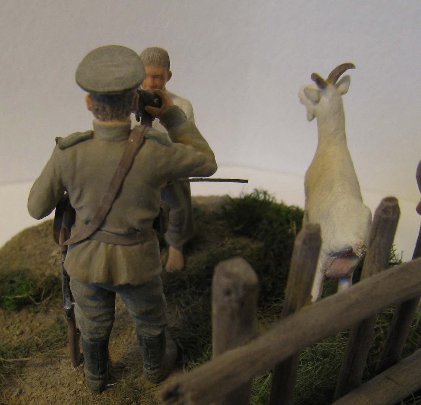 фигурка русского солдата фирмы MusterClub, коза из набора домашних животных фирмы Musterbox, мальчик из набора мирных жителей восточного региона той же фирмы(Musterbox).Основание из гипса,имитация грунта - молотый перец,песок.Трава из окрашенной пакли,забор из окрашенных веточек.Использовал краски фирмы Тамия и акрил фирмы Звезда.Буду очень признателен за критику в адрес моей первой работы