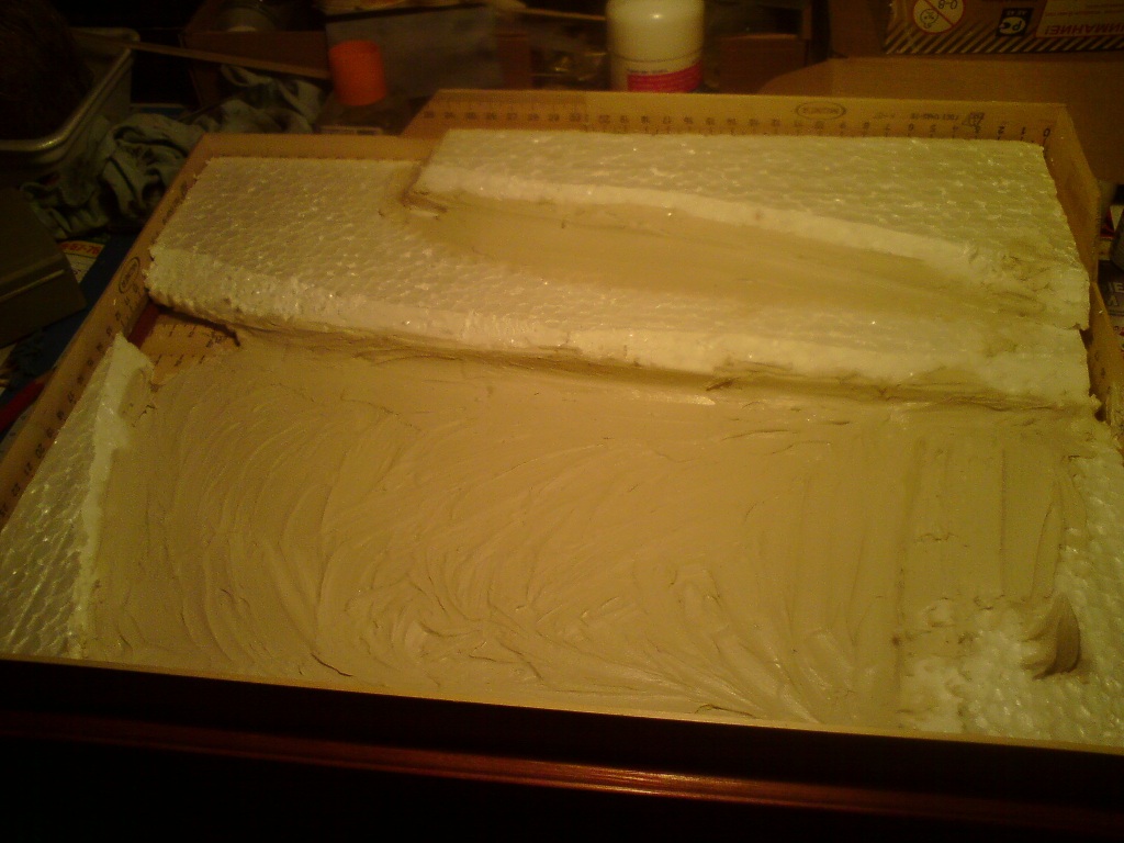Основанием диорамы - фоторамка с прикреплёнными деревянными линейками по краям. Пенопласт и шпаклёвка.