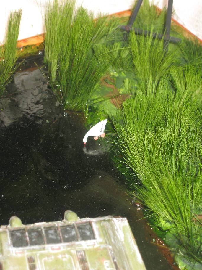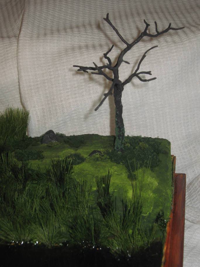 Добавил самодельное дерево из медной проволки, покрытой шпаклёвкой с ПВА, деревянный столб. Птица, пьющая воду - гусь из набора Tamya. Имитация воды - эпоксидная смола. Последний слой вперемешку с зелёным колером. Самодельный трос из проволоки.