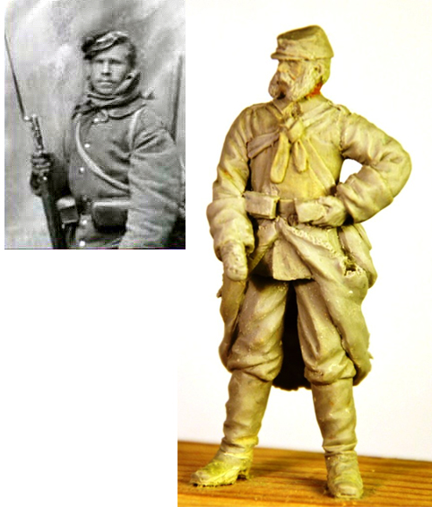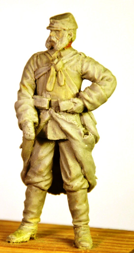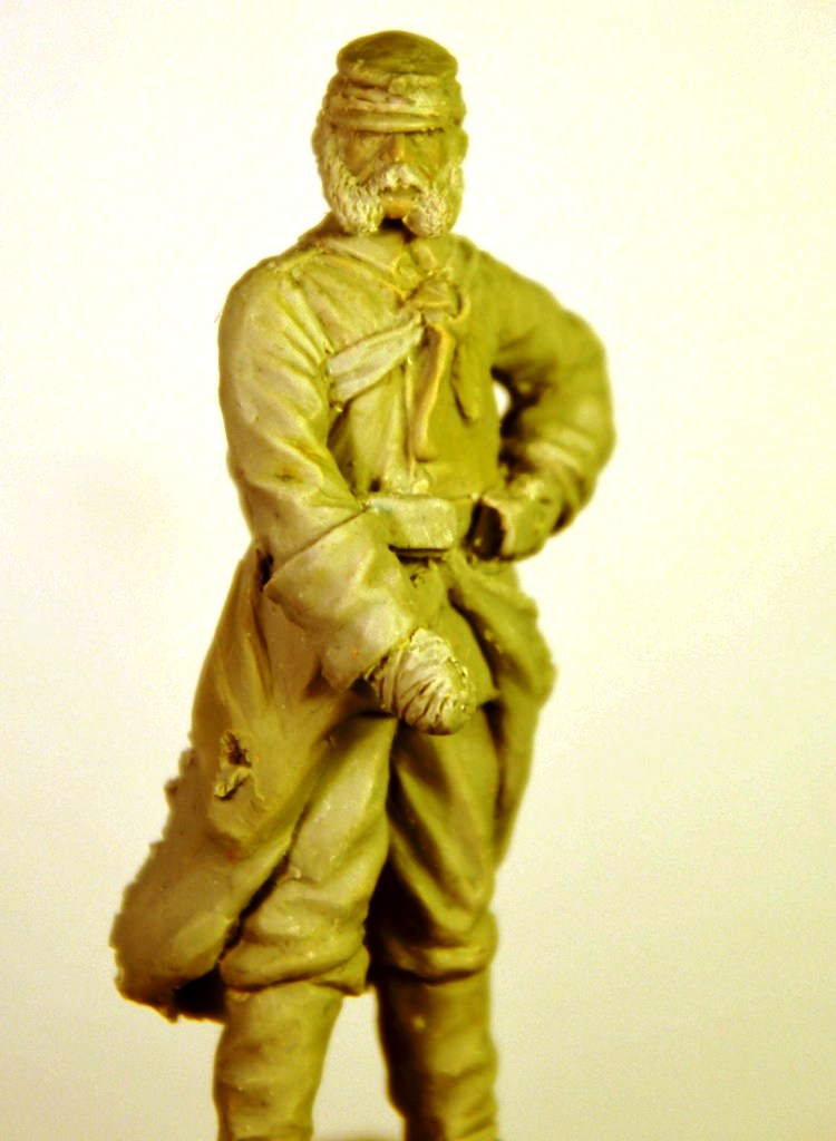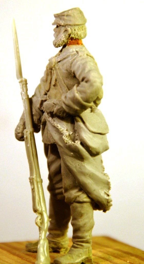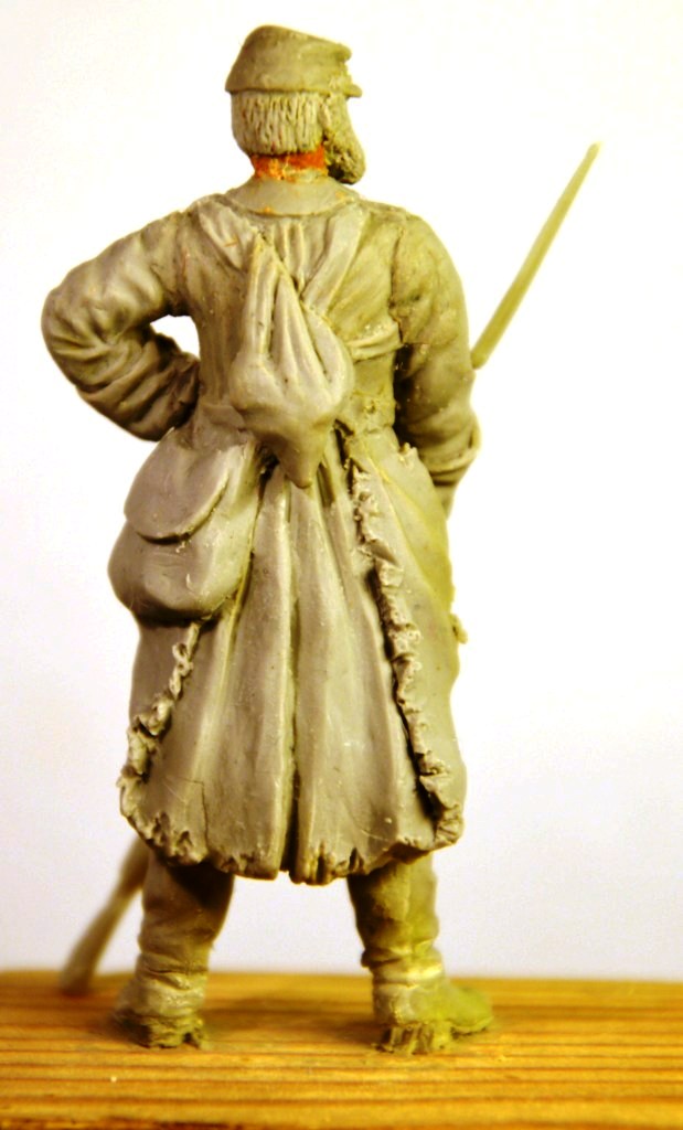 сперва была задумка,что должен быть с сигаретой.Ружьё взял от Chronos Miniatures.Шинель,не знаю как получилось в низу немного потрёпанная.Получился такой воин из боя в тыл,может на перевязку.В низу у каблука забыл снять пластилин,из-за этого вид не очень аккуратный.Теперь осталось продумать подставку