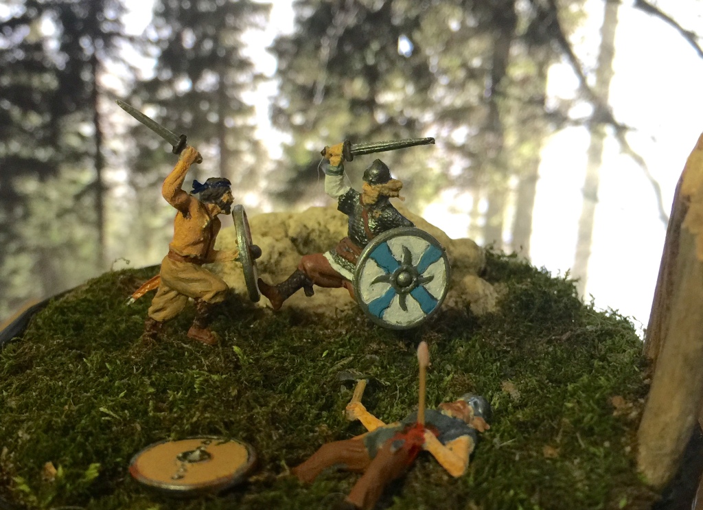 Первая работа, ранее никогда ничего подобного делать не пробовал. Сюжет – сцена набега норвежцев на одно из скандинавских поселений (шведы, либо датчане). К конкретным историческим событиям не привязана. Использовались миниатюры производства фирмы «Звезда», набор - «Викинги. IX-XI AD.», масштаб 1:72. Для покраски использовались акриловые краски «Звезда». Для основания использовалась жестяная крышка от банки, наполнение – земля, мох, природный камень, дерево.