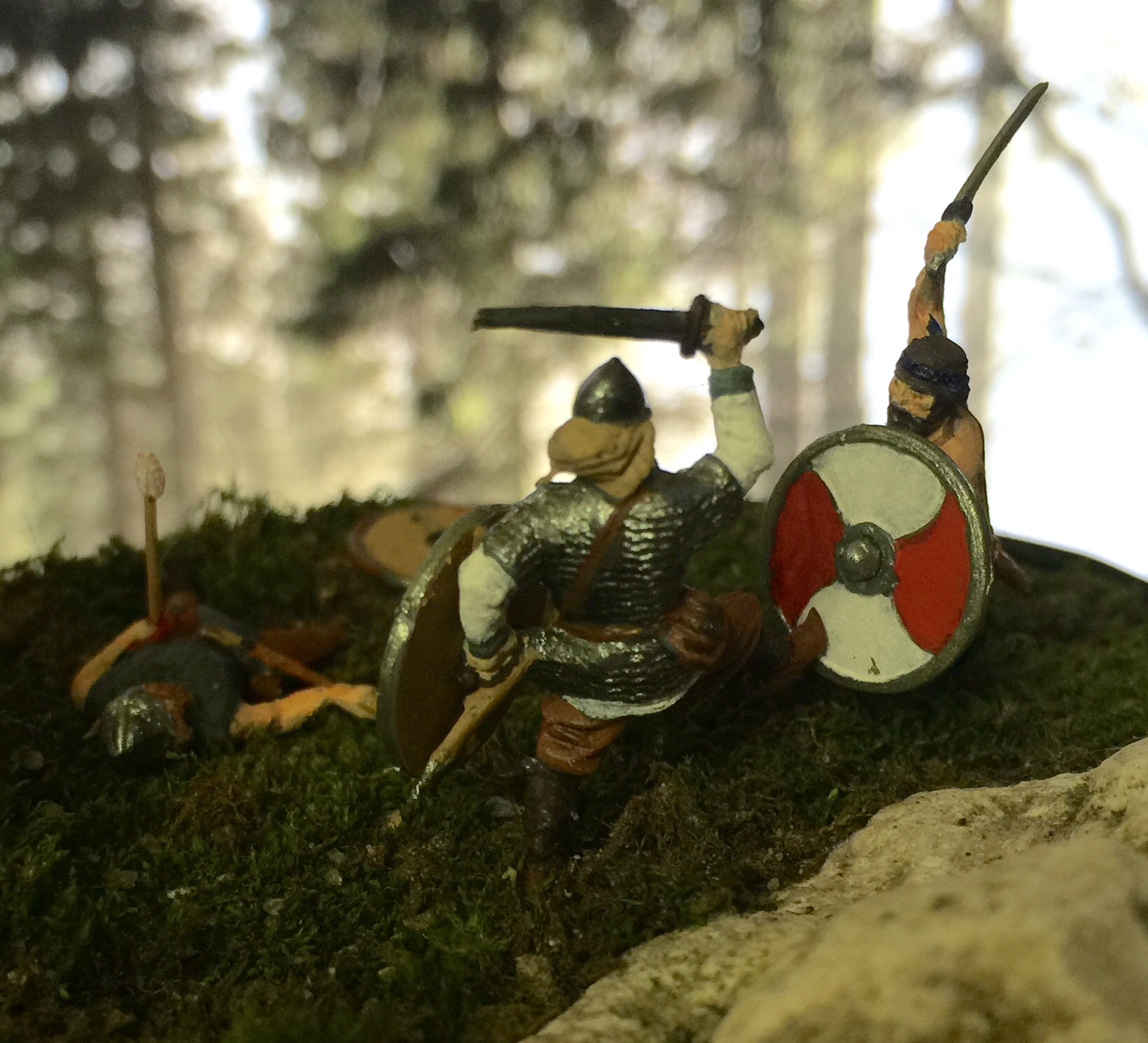 симпатично! хорошо подобрана поза воина в кольчуге - ногой бьет в щит противника.Интересно, что означает надпись рунами на подставке?