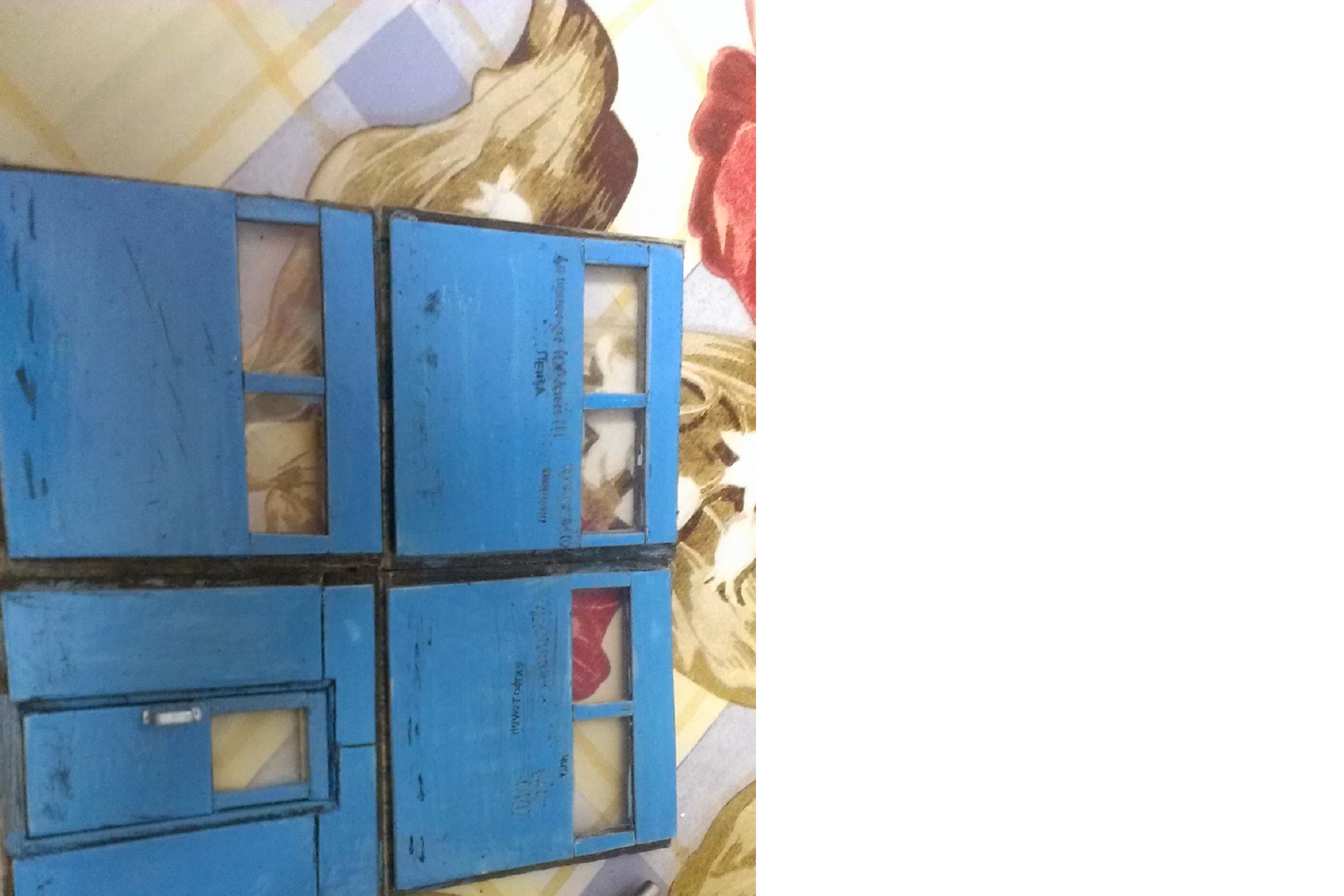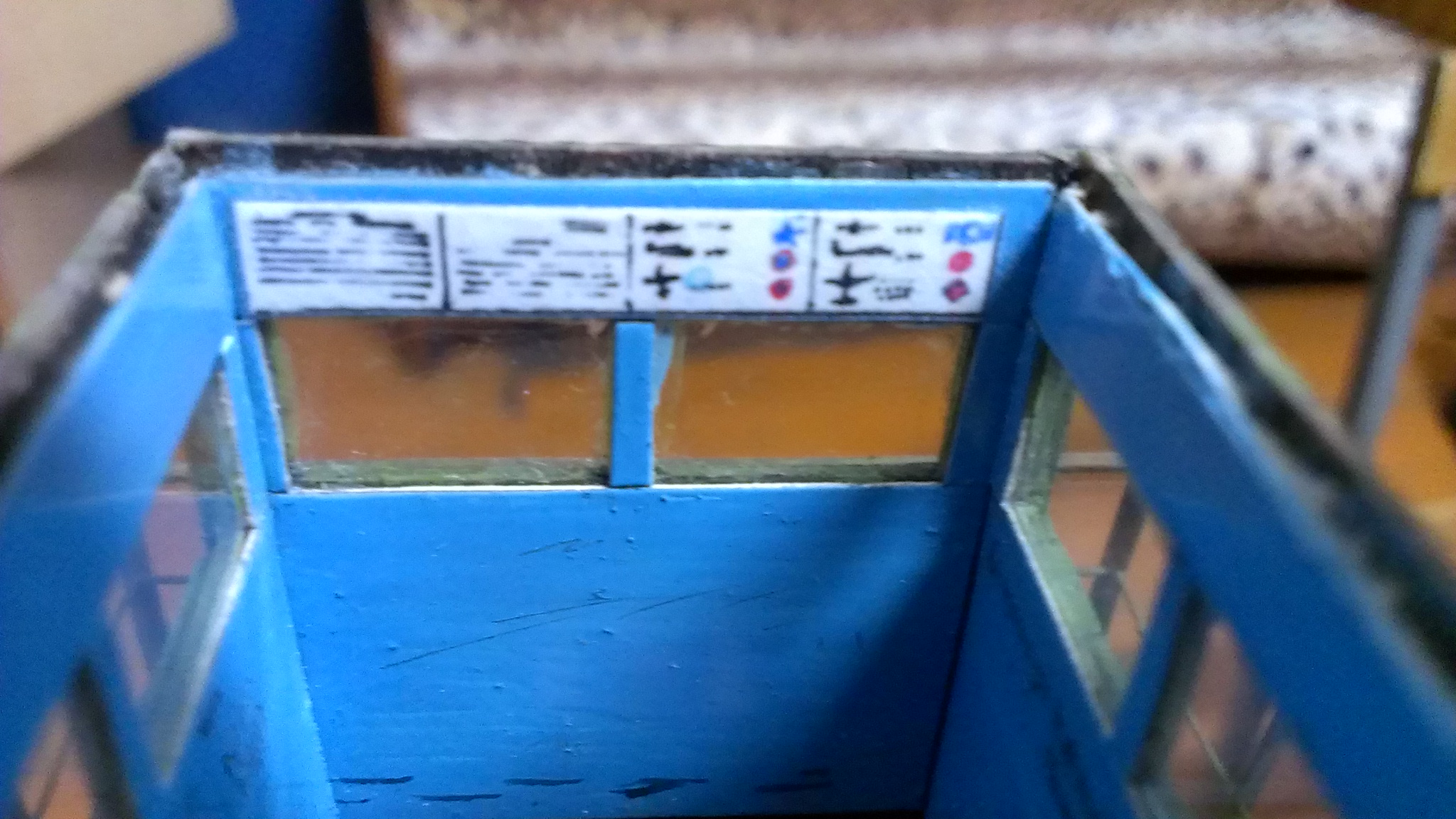 Из надписей армейский фольклор и служебная документация: алгоритм действий по паролю "Воздух", силуэты самолетов и опознавательные знаки. Их не рассмотришь т.к. не имею принтер (рисовал от руки), внутри должен стоять ТПБ (большой бинокль на станине))), пока не нашел подробного фото этого прибора.