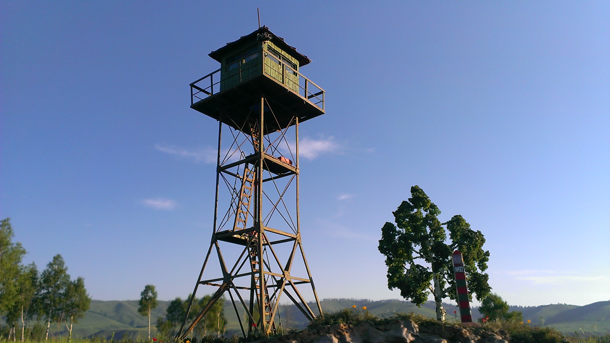 Это первая моя работа. Ни разу не видел диарам и виньеток на пограничную тему. Давно хотел сделать что то подобное и вот решился. По фотографиям соорудил вышку в два яруса из пластиковых уголков Эвергрин, будка из реек. Крышу хотел сделать из пластика, но передумал и сделал из тюбика от детского крема. Красил акрилом от Звезды, эмалью Хамброл, испльзовал Мастер-пигмент ржавчину. Масштаб 1:48, хотел в 35ом, но получилась бы большая. Сейчас пытаюсь сделать диараму, вышка стоит на берегу реки, пограничный знак, позади березка. Проблемма встала в окрашивании скального обрыва (ох уж эти скалы!). Ни как не могу определить цвета и оттенки! И фото с командировок смотрел и на Шилку ходил смотреть на скалы, а понимание не пришло (((. Вообщем вся работа встала. Еще хочу поставить на вышку ТПБ и часового, но где взять фигурку в таком масштабе и еще чтобы пограничник не стоял как на картинке, а так как несли и несут (и я в том числе) службу пока никто не видит )). Жду комментов и конструктивной критики. И еще добавляю фото березки.