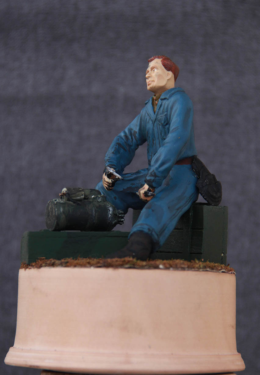 Фигура из эпокселина голова 5,45 окрашен темперой. Масштаб 1/16 стартерделал сам тоже из эпокселина ящики палочки от мороженного.Трава мох. Подставка- груша.(прикупил токарный станок теперь подставки делаю сам)