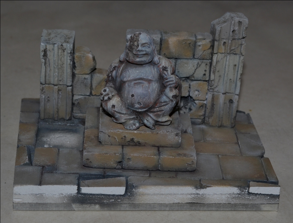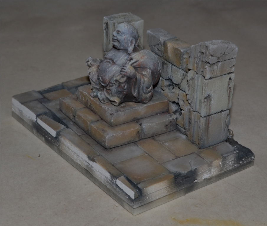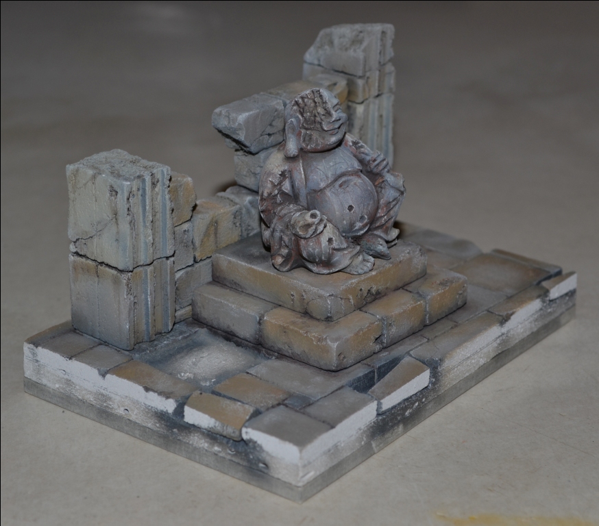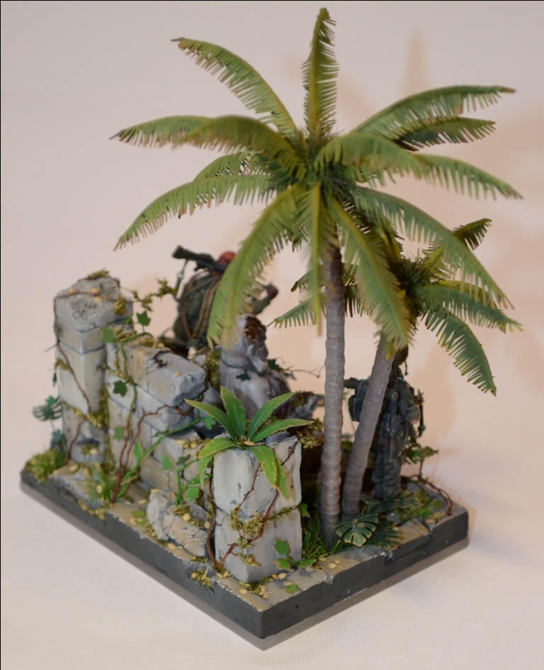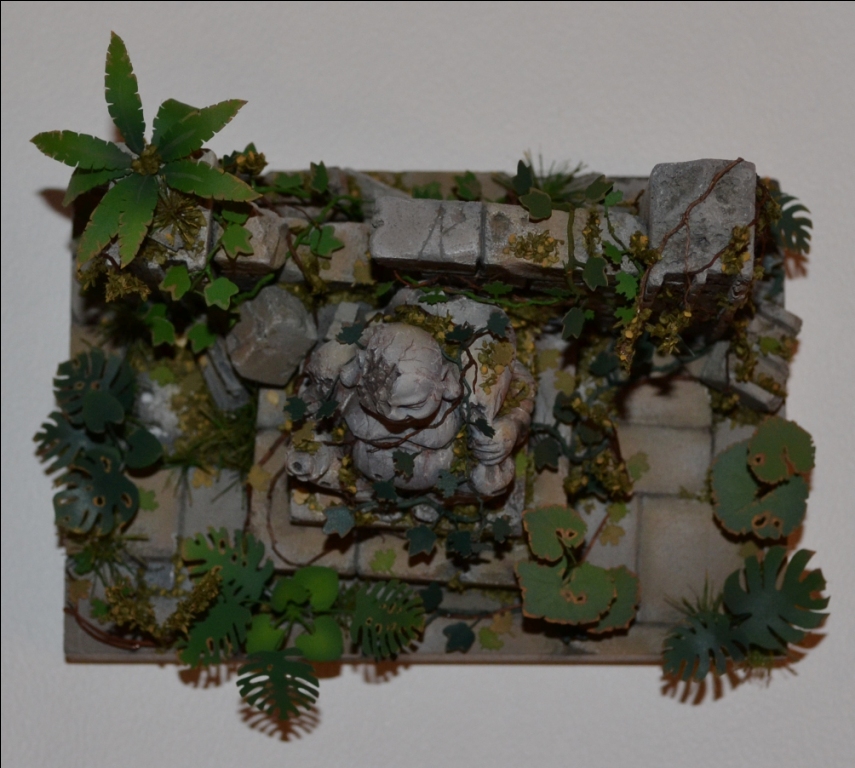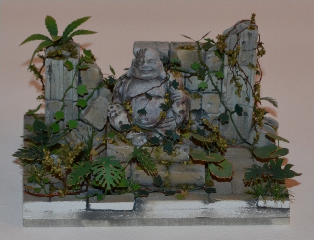 ...пальмы не отменяются, в доработке. Потеки на камнях и на Будде присутствуют от дождя, грязи и т.д. Травянистая растительность тоже есть. Если добавить еще и зелени на каменистые поверхности, то все сольется! А мне этого не надо. А тропический мусор появится в самом конце после установки пальм и фигурок.