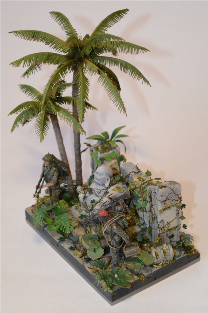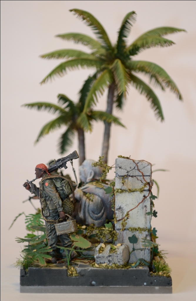 Приветствую всех! Хочу поделиться началом своей работы над диорамой 1/35. В композиции будут использованы фигурки "BRAVO 6", оружие "TANK", пулеметные ленты"ZEBRANO", фигурка Будды. Все остальное делалось самостоятельно. Элементы основания храма и разрушенной стены отлиты из гипса отдельно друг от друга и доработаны различными инструментами до реалистичности. Стволы пальм сделаны из алюминиевого провода и обмотаны пергаментной бумагой. Листья пальм и другой растительности нарисованы разных размеров в векторной графике на компьютере и вырезаны на плотере. Фото о дальнейшей проделанной работе и окончательного варианта диорамы постараюсь выложить в скором времени.