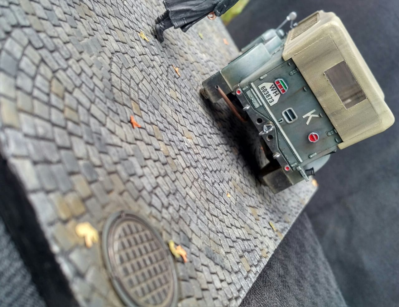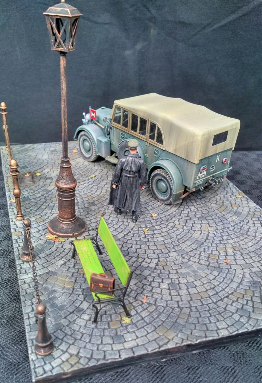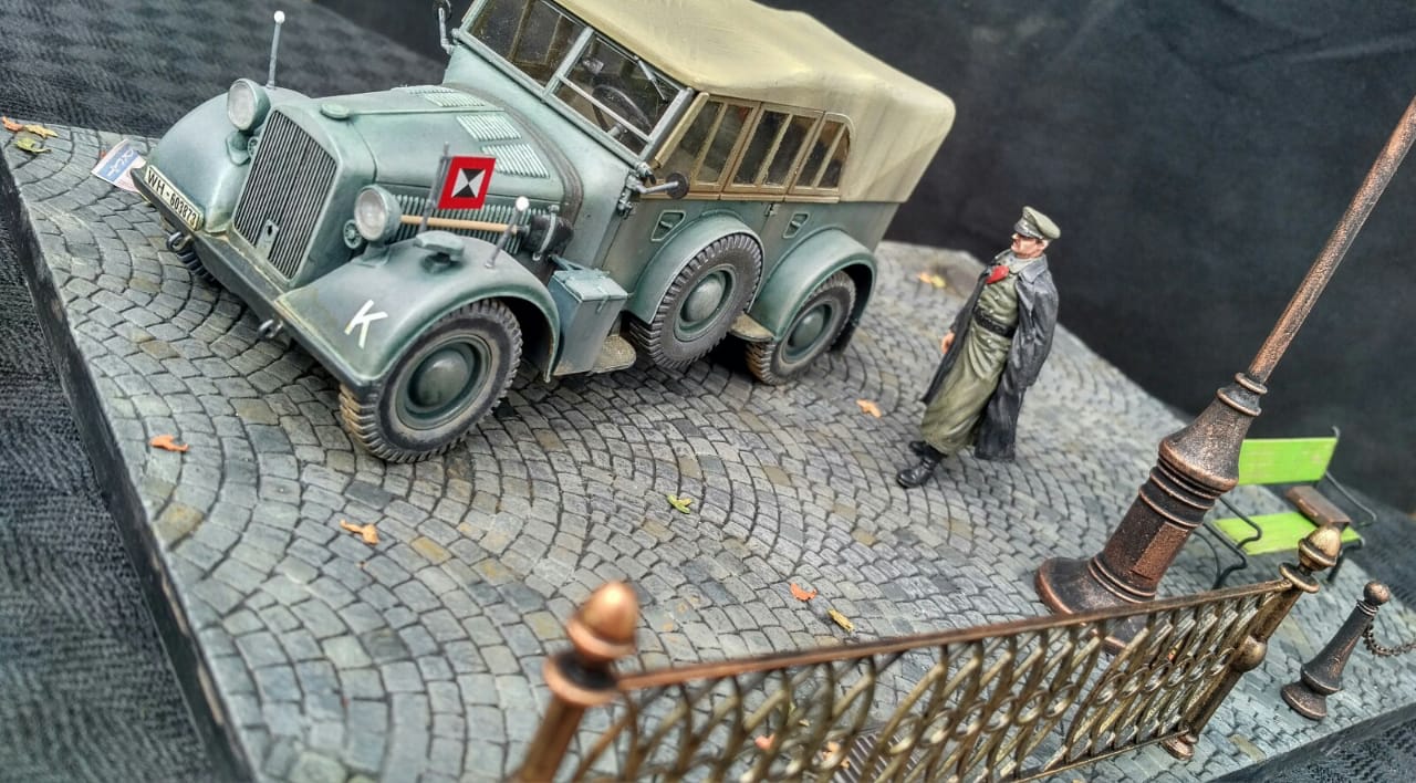 В главной роли хорошо всем знакомый Хорьх кфз.15 от Италери. Брусчатка и антураж от Мини-Арт. Фельдмаршал от Драгон. Дополнений использовано не было.