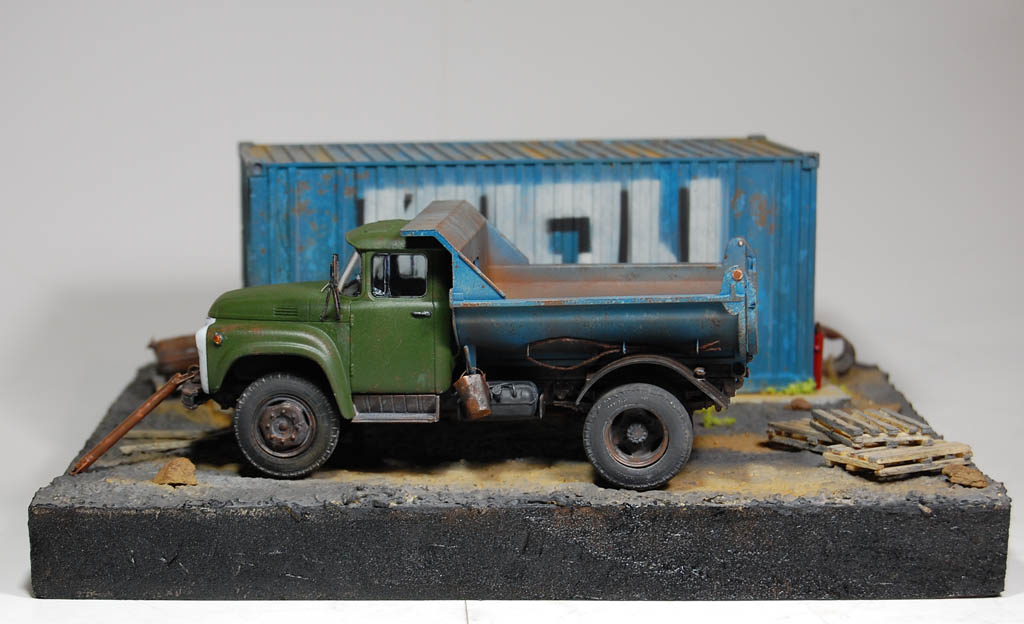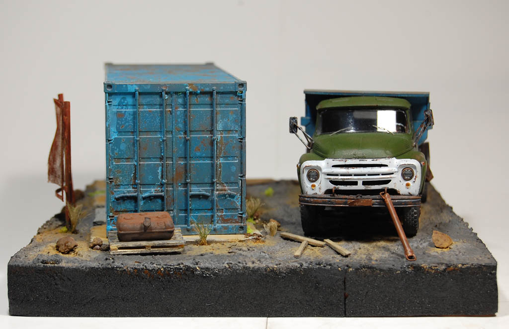 Материал подставки пенополистирол,имитация земли с помощью шпаклевки по дереву и песка и покрашено Гуашью)Сам самосвал покрашен акрилом Тамия