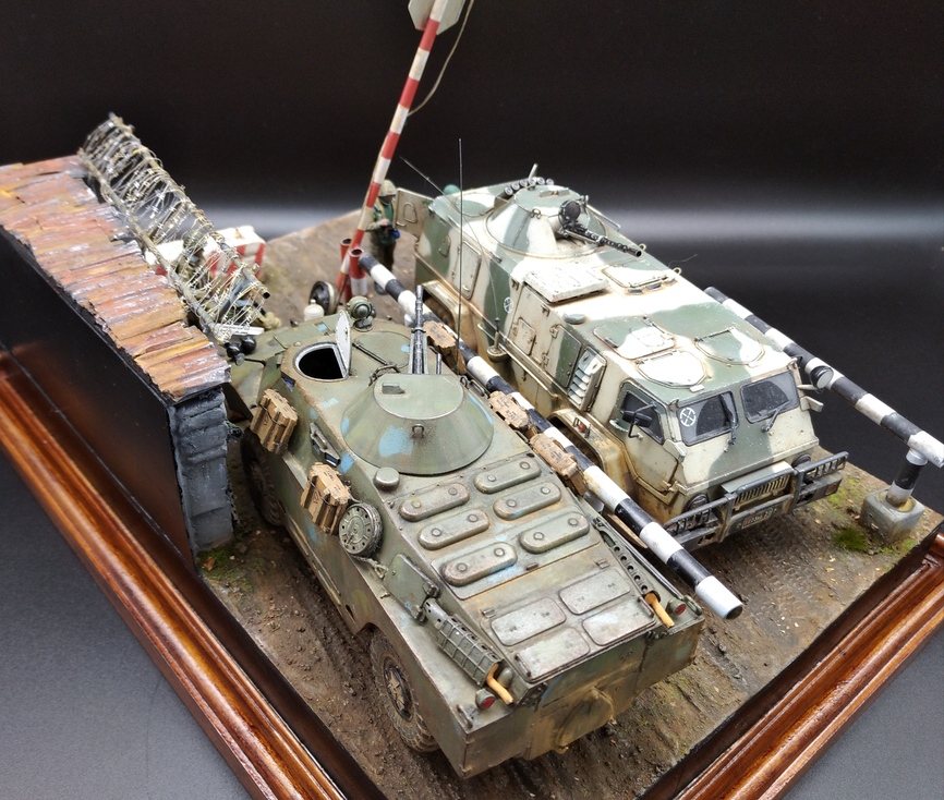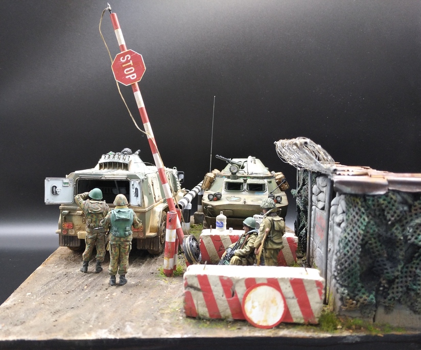 Давным давно хотел сделать что-нибудь из темы на вторую чеченскую, в коей довелось поучаствовать командировками в ЧР. Сначала была мысль сделать ПВД в Гудере по своим фото с "Бардаком" (БРДМ),потом зашла тема с "Водником" ( бронеавтомобиль) в Ханкале. И в один прекрасный момент решил обе темы объединить в одну с композицией блокпоста,коими были утыканы все дороги тогдашней Чечни. Собственно, так и возник этот "Райский уголок" где-то в районе Герзельского моста. Жизнь на блокпостах кипела полным ходом, дневной зной менялся ночным диким холодом, обстрелы,провокации,досуг: кто во что горазд...ну и конечно, работа,работа... Проезжавший мимо "чудоавтомобиль" или как говорят,"коробочка", вызвал неподдельный интерес у обитателей поста.