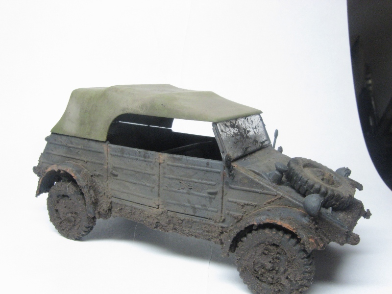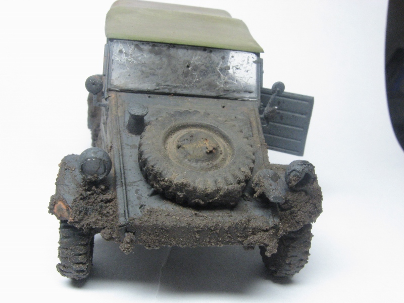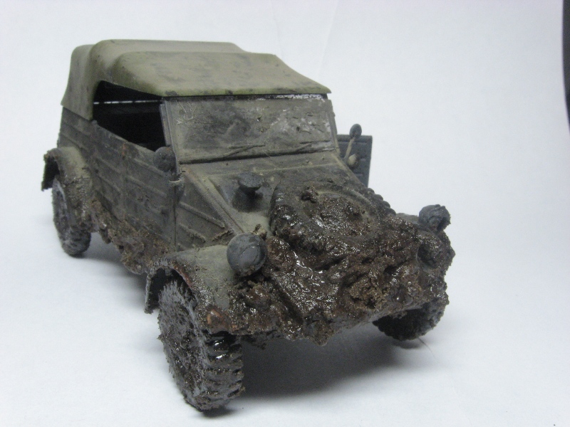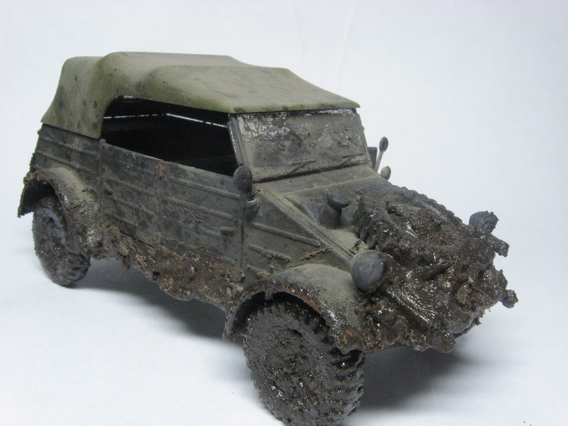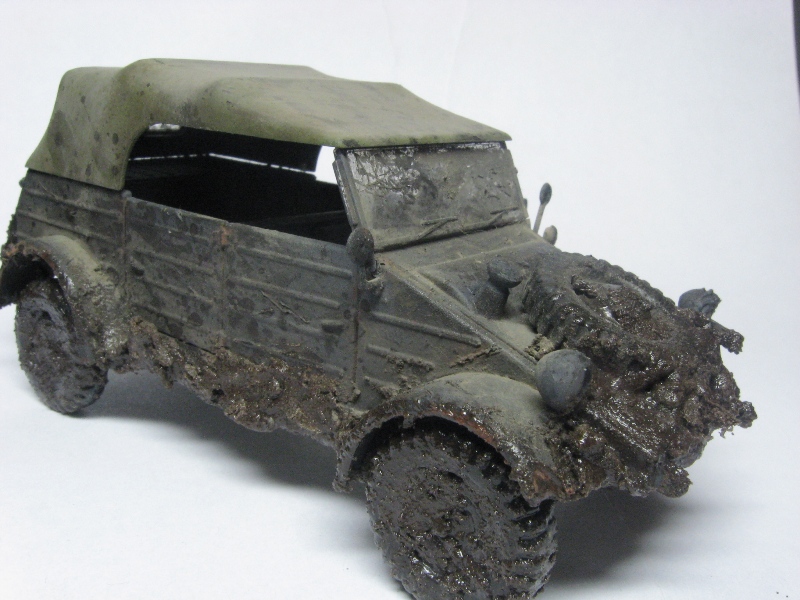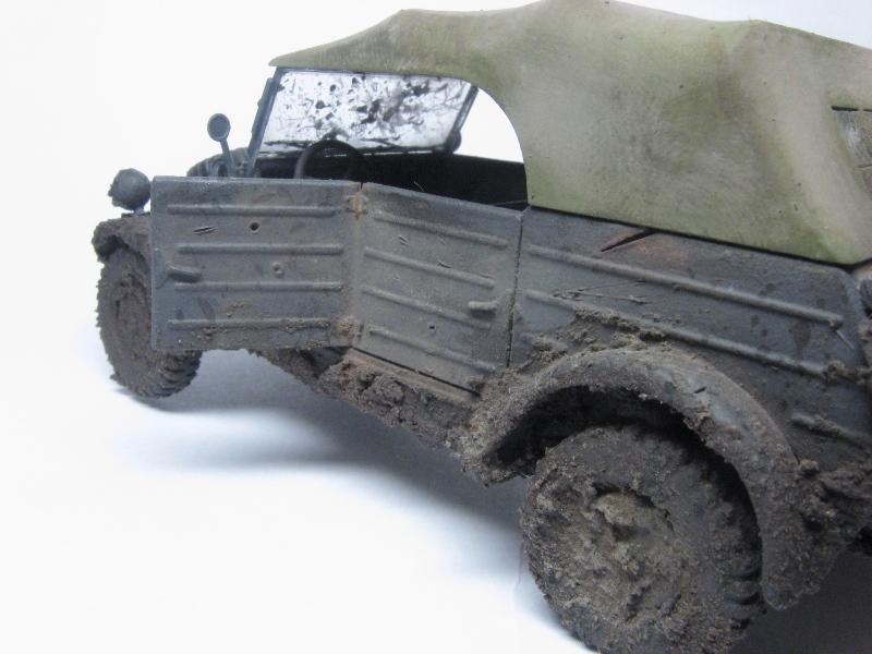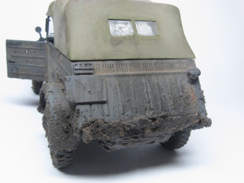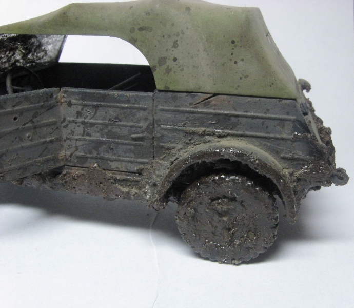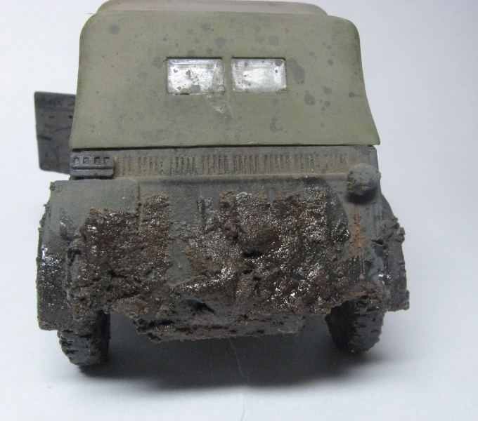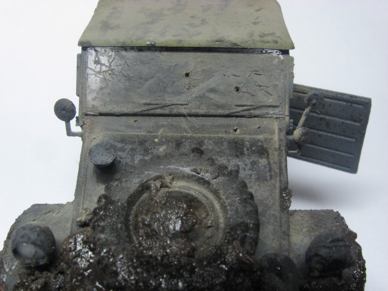 Грязный чухон... Что рекомендую сделать: радикально пару раз обработать пигментами разных оттенков. Желательно, с применением фиксатива. Такие чухоны, как правило, ещё и весьма пыльные. Далее, раз уж мы замазали его всего пигментом, нужно имитировать сырую грязь. Это просто- кисточка и глянцевый лак. В подсыхающих местах можно получить эффект с полуматовым.