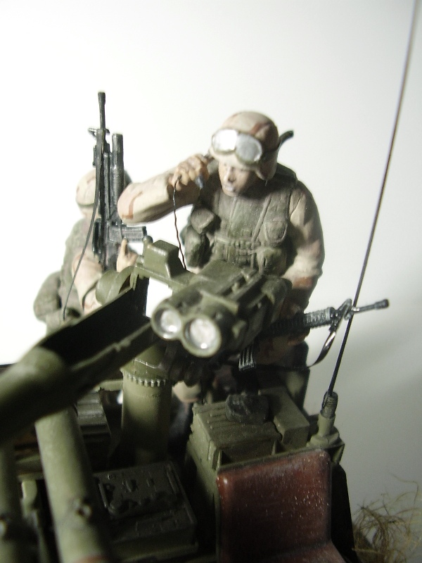 Аккуратненько, но "изкоробочно". Несколько соображений по возможной доработке. Отверстия облегчения на дисках колес стоило бы засверлить поглубже. Такой камуфляж, как на солдатах, появился в войсках (в том числе в USMC) в начале 90-х, когда все М825, ИМХО, из штатов частей морпехов вывели. Шнур трубки радиостанции у амеров витой.