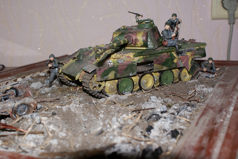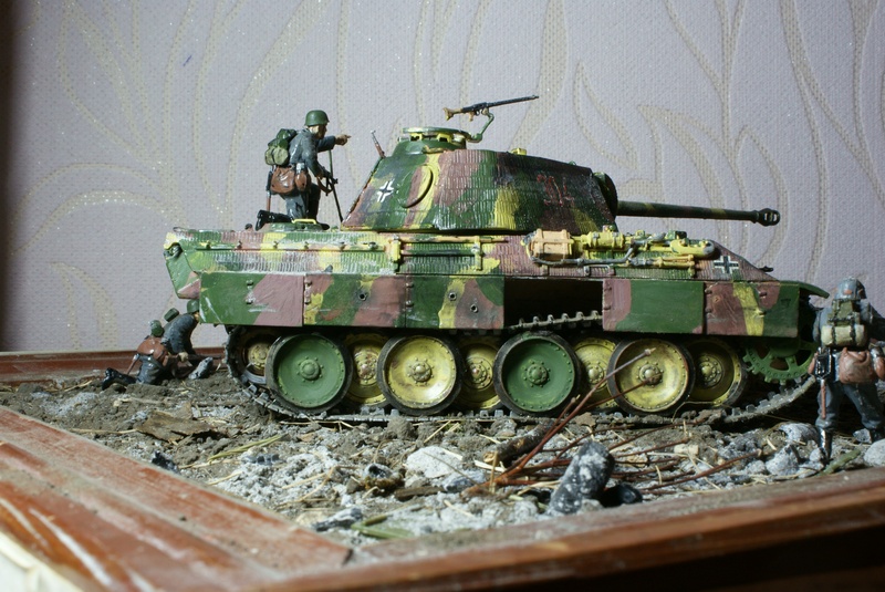 пантерка чистовата для такой "грязной" диорамы,фигурки блестят,незаделаны стыки рук с туловищем + гусеницы мог бы хотяб к колесам приклеить(сверху)