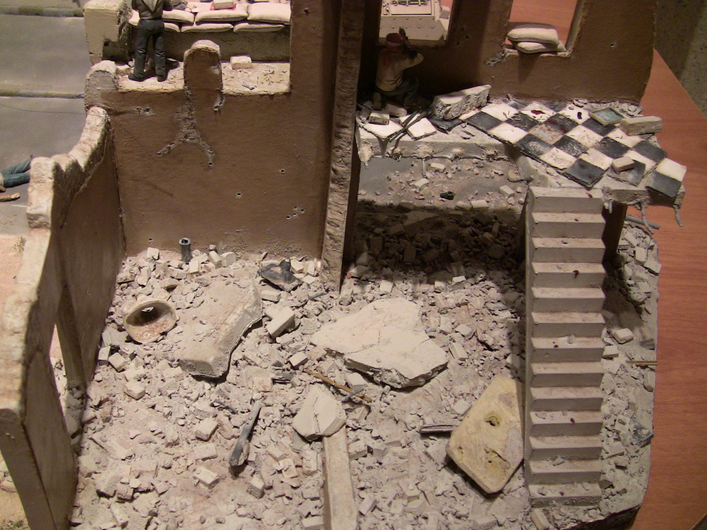 Тут же диорама в полном смысле слова (смотрим общее фото скажем сверху) -воссоздан кусок улицы города, бой. По диораме понятно место действия, время действия, сам конфликт плюс изображена динамическая сцена.