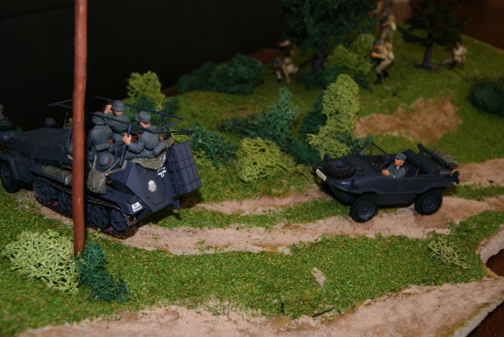 Использовались наборы (частично с конверсией): "ханомаг":) тамиевский, мото и швимваген от италери, наши бойцы от звезды (пехота и переделанные из артеллеристов). Фигуры красились в основном хамброловской краской.
