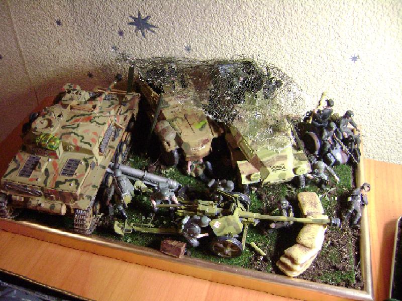 Только надо бы место поэффективнее использовать: перед пушкой ещё целый мотоцикл мог бы влезть Да и пехоты можно ещё много натыкать. А то кое-где из-под фигур и моделей пятнышки земли просматриваются. Непорядок! Нужно было всю полезную площадь занять живой силой и техникой - без малейших промежутков.