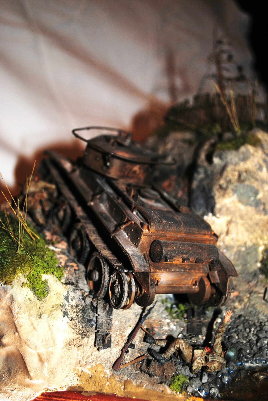Делал диораму по фотографии, опубликованной в книге Бориса Пидемского "Под стук метронома". Постараюсь отсканировать ее и выложить либо на форум , либо в виде ссылки. На ней изображены подбитые танки БТ, погода достаточно ясная, снега не видно и складывается впечатление.что достаточно тепло.
