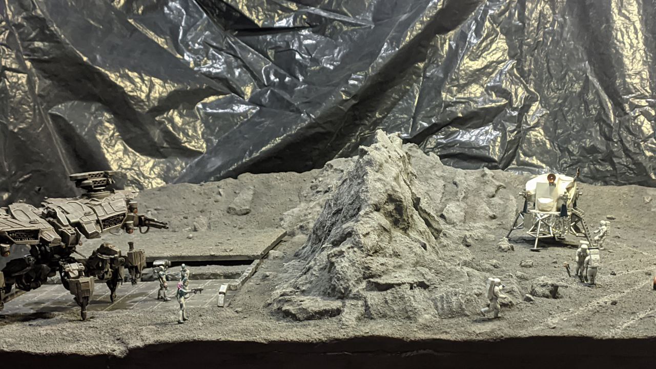 Фантастически - юмористическая диорама. «Хьюстон! У нас проблемы!!!» Размер 675х510х140 мм. Масштаб 1:72. Все модели и фигурки 3д печать. Взяты из открытых источников. Краски акрил. Основа - вспененный полистирол. Терра - поролон, шпаклевка, песок, мелкий гравий, цементная пыль и ПВА. Мой ответ на многолетний вопрос - были ли американцы не луне?. - Да были! Но что-то пошло не так ..........