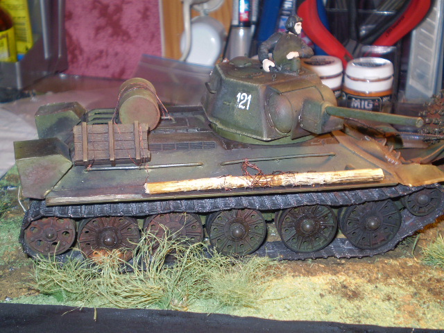 Алексей Хахулин, во-первых, хотелось бы снимков почётче, не разобрать ничего. Во-вторых, фотографировать лучше при искуственном освещении с 2-х точек. Это по качеству предоставляемого наглядного материала. По композиции и рабте, что рассмотреть удалось. Первое - сетку над жалюзи вы совершенно неправильно иммитировали, ячейки под углом 45 градусов идут и они более мелкие. Второе - бочку так на Т-34 невозможно привязать - от жалюзи трос или верёвка оторвётся, точнее, планка скорее всего не выдержит, а на люке доступа к двигателю прицепиться не за что. Что делают гильзы на надмоторной плите - непонятно, "Дегтярь" на башне - тоже. По фигуркам - Показывающий командир и солдат в гимнастёрке "руки в боки", ладно, пришлые, не из экипажа. А остальные, судя по композиции, имеют прямое отношение к данной машине. А в ней не 5 человек экипажа, а только 4, так что один лишний. А когда на башне сидячей фигурки нет, то непонятно, куда оставшийся боец смотрит, как бы вываливается из общей сцены. В отбчем - работайте, товарищ!!!