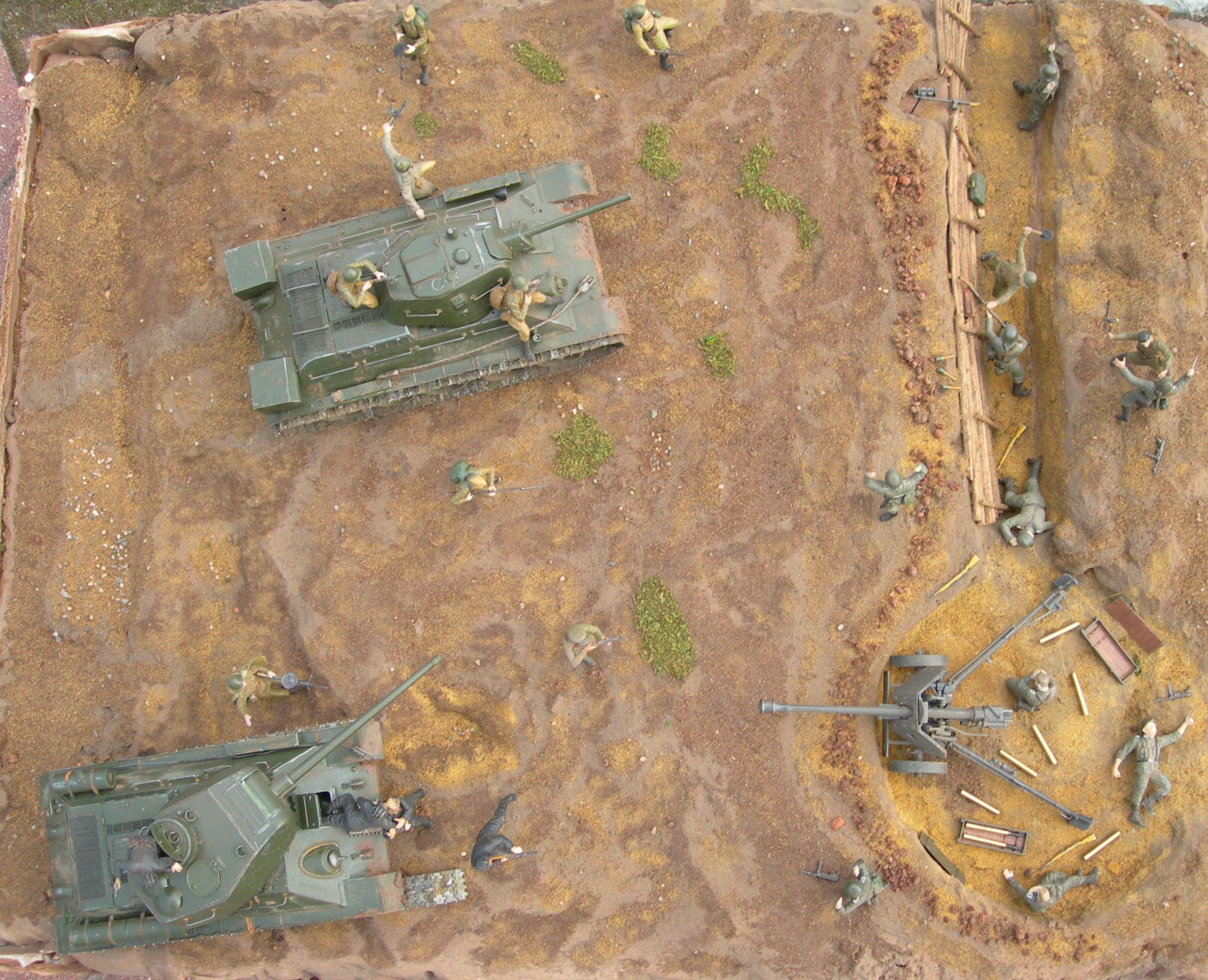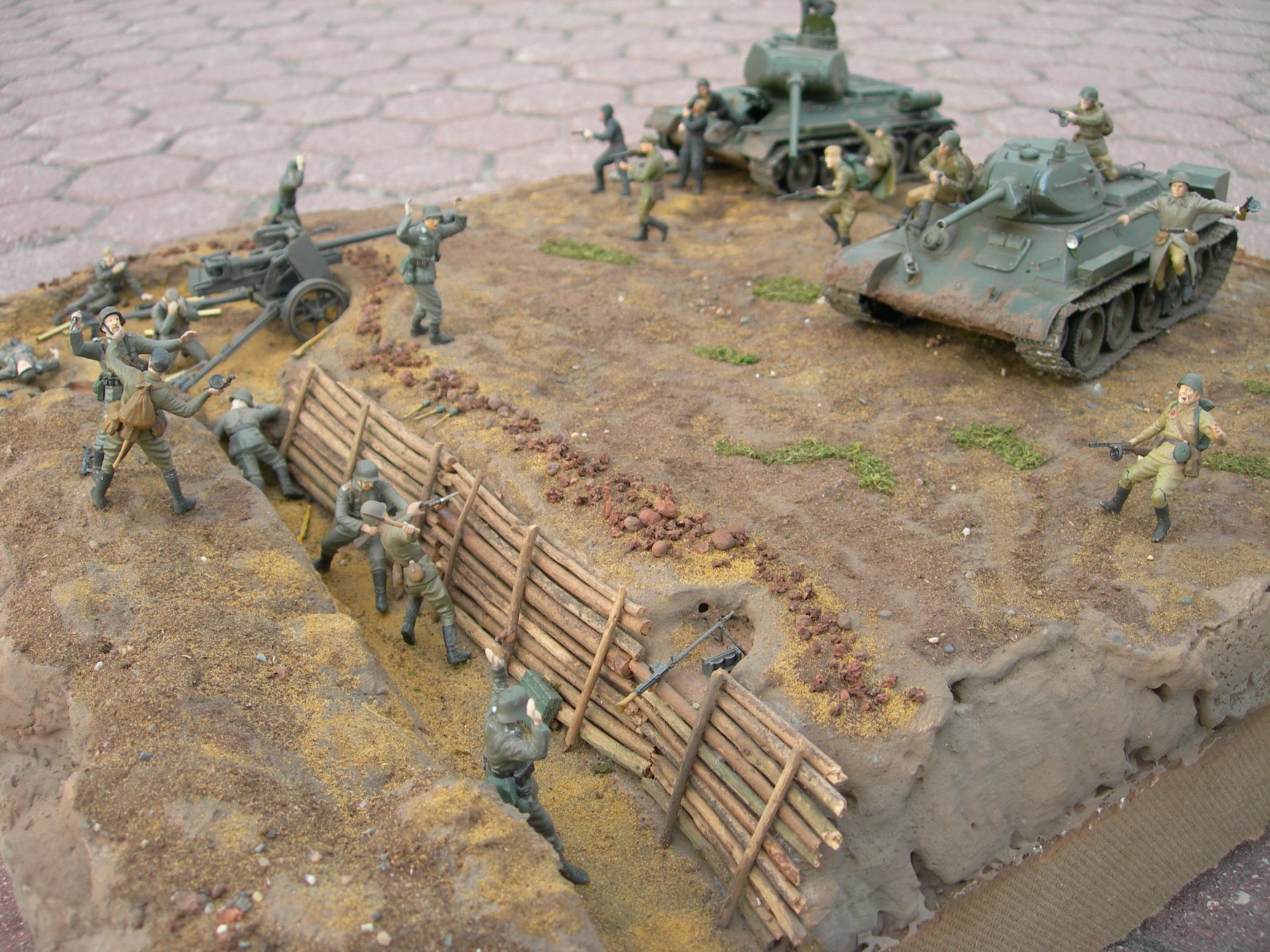 Присоединюсь к коллегам - работы сделано много, но это теряется из-за тяги к гигантизму. В результате нет общей диорамы, а есть танки и фигурки, расставленные в хаотичном порядке. Например - зачем человек в плащ-палатке тянется к подбитому танку? Как бьющий автоматом красноармеец оказался на той стороне окопа? И вопросов таких очень много.