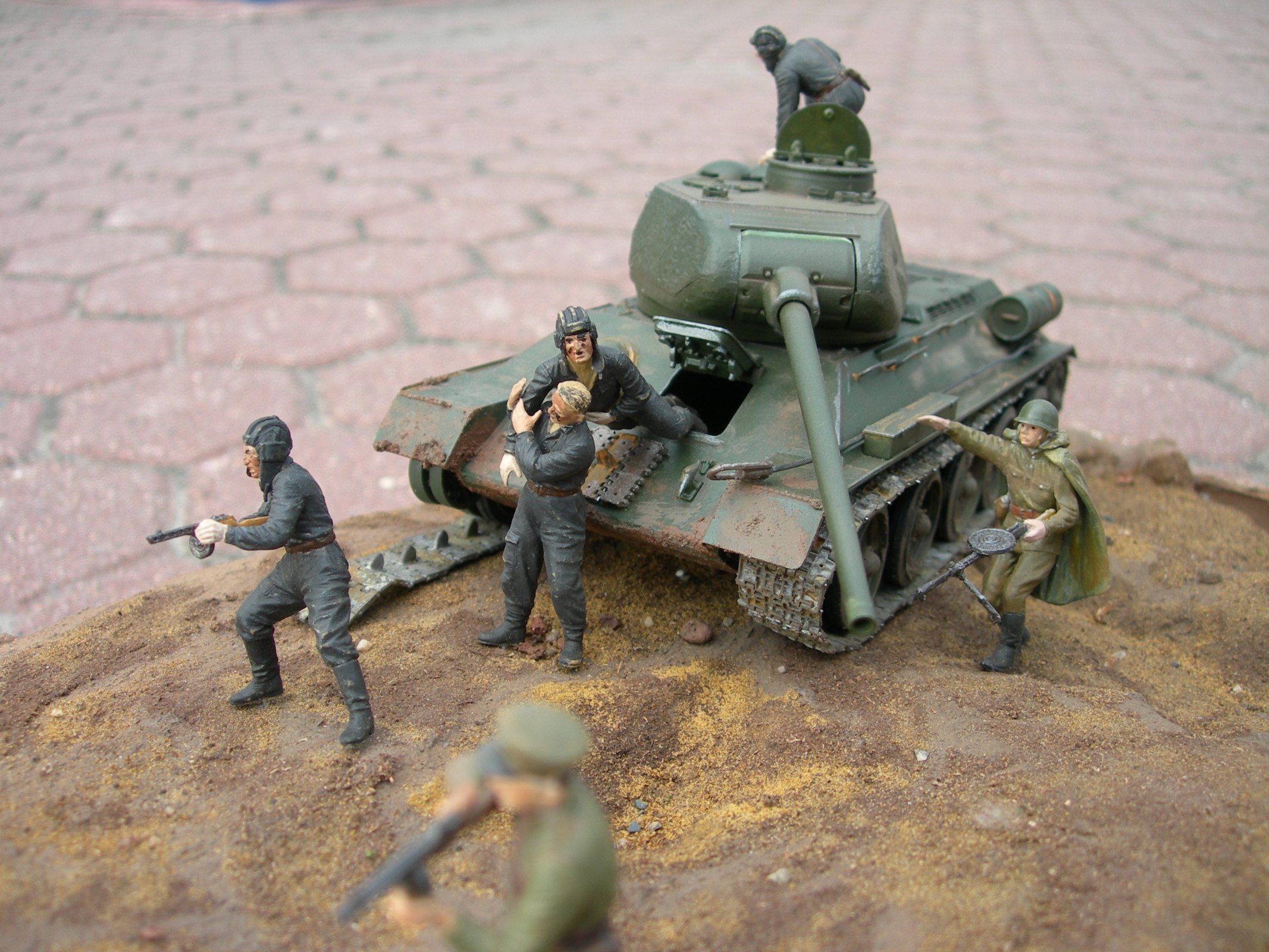 Andrey77, а вас не смущает, что танки, э-э-э, так сказать, по времени не подходят - очень-очень мала вероятность, что Т-34 с такой башней и Т-34/85 могли встретиться на одном пяточке фронта. Да, и кстати, фигурки советских бойцов тоже на несколько другой период, нежели Т-34/85.
