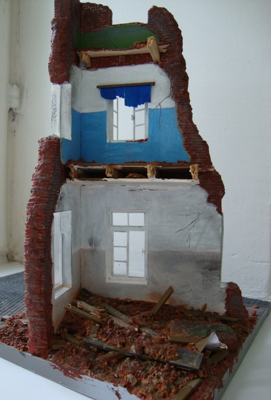 Из доработок- в рамы вставил битые "стекла", изготовил подоконники из жести (использовал старые дискеты), на тротуаре битый кирпич и палочки от мороженого