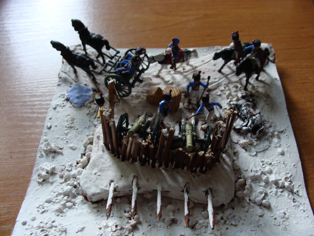 Хотя поразглядывал, порассматривал и сразу есть замечания. Первое: снег надо делать(самое простое - сода на клей ПВА),а не просто покрывать поверхность краской. Второе: это собственно укрепление. Складывается впечатление, что лошадь на диораме пала от того, что её замучили, пока волокли на позицию гигантский плоский валун, при выдалбливании укрытия в котором пала большая часть личного состава расчётов. И указатель (у меня, как Вы понимаете, тут особый интерес): его не видно. И что он делает на огневой? Может, попробовать переработать? Главное - не опускайте руки. Я свою первую диорамку отдал маме и теперь жалею: она поставила её на видное место и всем показывает, какой у неё гениальный мальчик(сорока лет от роду!)Стыдно, но зато отрезвляет. Удачи, Никита!