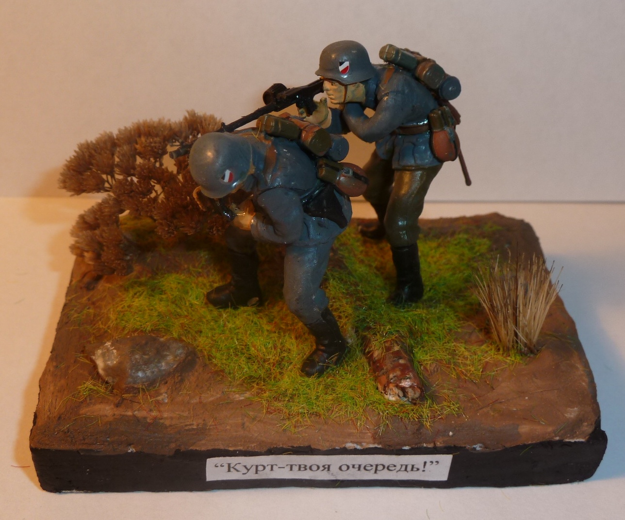 Мда."Учите матчасть!"Косяков море.Щитки на касках не с той стороны,"кекс" у MG-34 так же с обратной стороны и не черный,ручка бакелитовая и ремень надо сделать,фляги на поясной ремень не повесить(они цеплялись карабином за полукольца).Стыки прессформ зачищать требуется.Разбитой каски не увидел как и рамки из реек.Про остальное сказали.