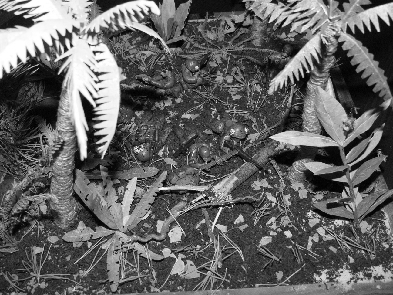 Лепил просто из обычного детского пластилина. Основание сделано из пластинок ДСП, засыпал чёрным чаем, лаврушкой, сухой листвой, немного мха. Пальмы из мешочных ниток. На создание диорамы толкнул фильм " Мы были солдатами"Сюжет: Дождь, грязь, назойливые насекомые, усталость, дырявые сапоги. Идёт взвод "Американских мальчиков" и штатов Техас, Канзас, курят,смеются разговаривают. И тут выстрел... Билли упал замертво, и сразу автоматные очереди со всех сторон, крики Вьетнамцев, взрывы, обстрел такой, что невозможно поднять голову. Все разом упали в грязь, казнив при этом своё оружие. Командир понимает, что взводу приходит конец, взвод окружён. При детальном рассмотре диорамы, становится ясно, что действительно, приблизительно через 5 минут, не останется никого...