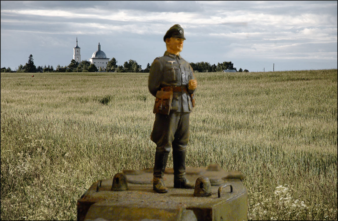 Первоначально работа называлась" Они еще не знают.."на диораме присутствовали немецкие мародеры , первые дезертиры, веселые солдаты, и лишь немецкий офицер стоит задумчивый и понимает , что все не так просто. а сейчас когда опубликовывал именно это пришло в голову , ну и еще думал "спящий гигант". так то не патриотично получилось, но мы то знаем , что Россия не только выдержала!!!