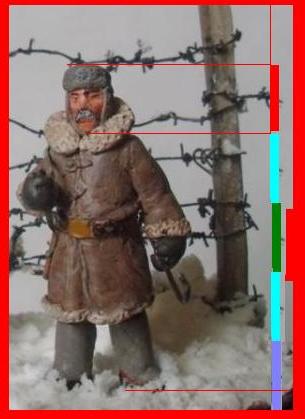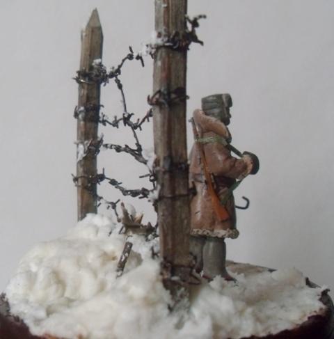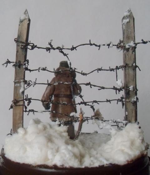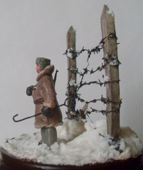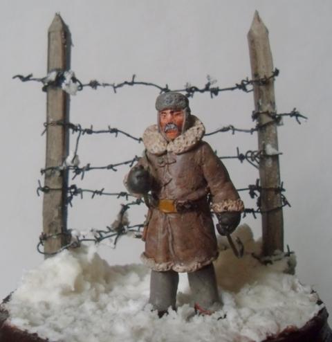За колючкой -40, какой-то отмороженый урка рванул в бега. Старый конвоир спокоен: далеко не уйдет, не поймают - так замерзнет. В руке держит крюк, с помощью которого цепляли застреленного зэка за одежду и тащили в лагерь. Фигурка из эпоксилина, окрашено акрилом. Делал в 35м масштабе, но какой-то промах был допущен: высота в валенках и ушанке 55мм, но лицо в сравнении с фигурками от "Звезды" больно крупным вышло, карабин как-то не по размеру... Основание: крышка от мармелада, масса для лепки (смесь КЕРА и JOVI). Снег-смесь белого силиконового герметика с ПВА и содой. Хотел отправить в Галерею, но смотрю и понимаю: накосячил, а где - не пойму.