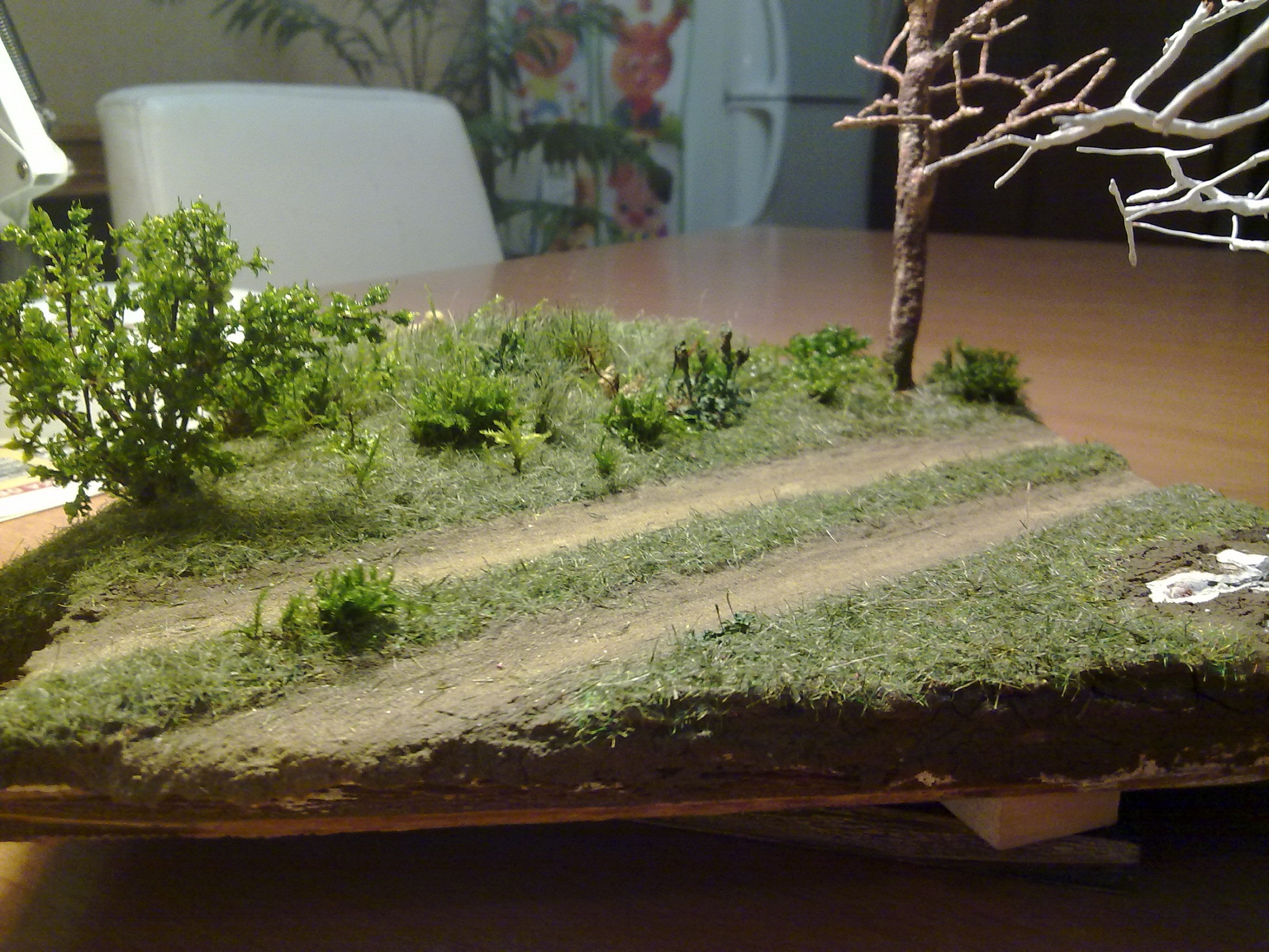 Основную лужайку делал из пакли,описаний много,покрасил аэрографом в 2 цвета потом нарезал около 3 мм и посыпал поверхность.Куст сирени из маленьких веточек и мха(нашел в лесу осенью)и остальные кустики из мха 4-х видов.Мох очень хорош тем что его можно сбрызнуть водой и он оживает,раскрывается,эффект классный,я смешал немного глицерина пва и воды и просто кисточкой прошелся по мху.Деревья из проволоки и тамиевской шпаклёвки,краска тоже тамиевская.Земля и песок натуральные из огорода тёщи :D