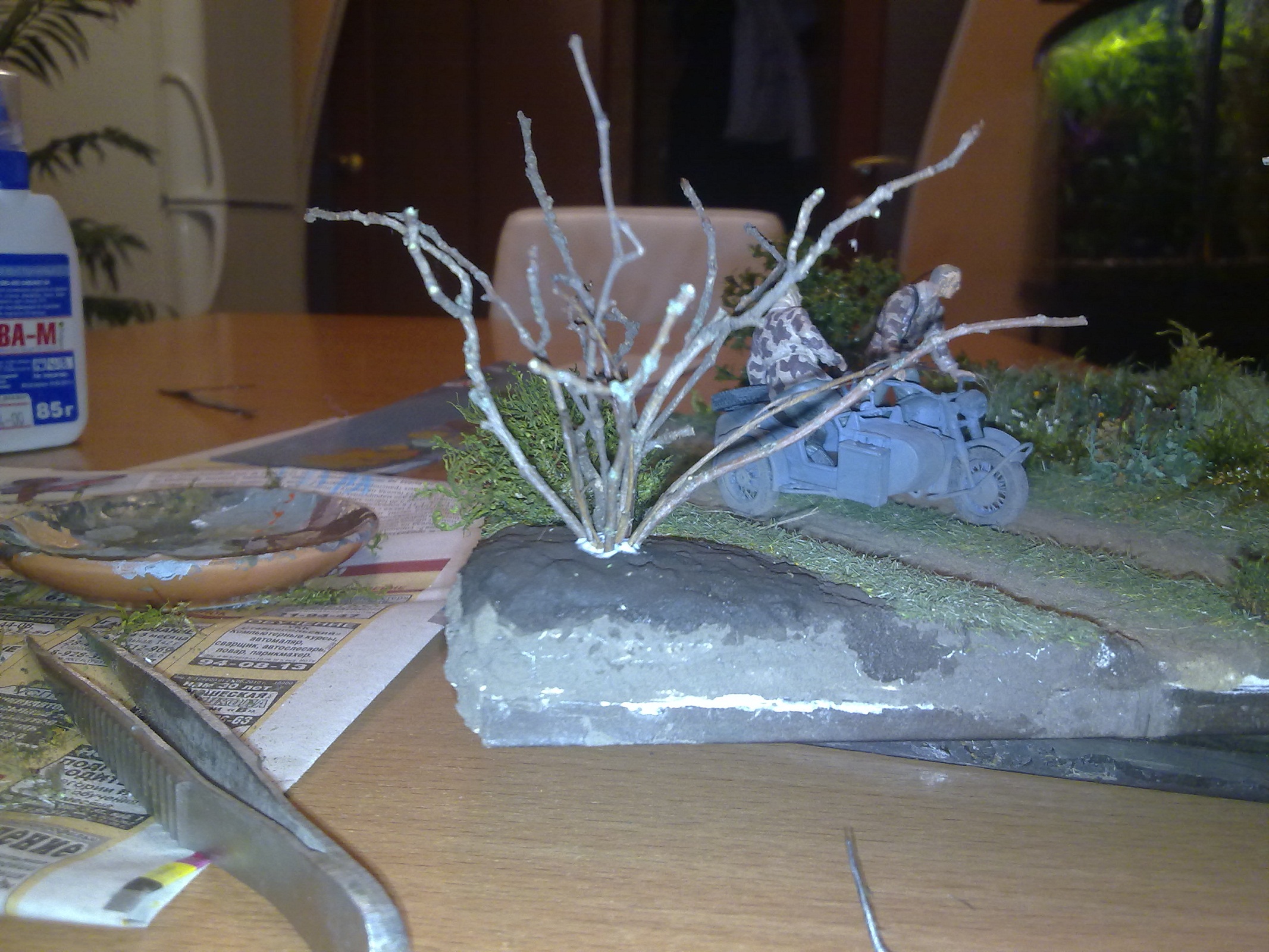Затем как всё высохло, прошёл по веткам смесью ПВА,глицерина и воды,на глаз